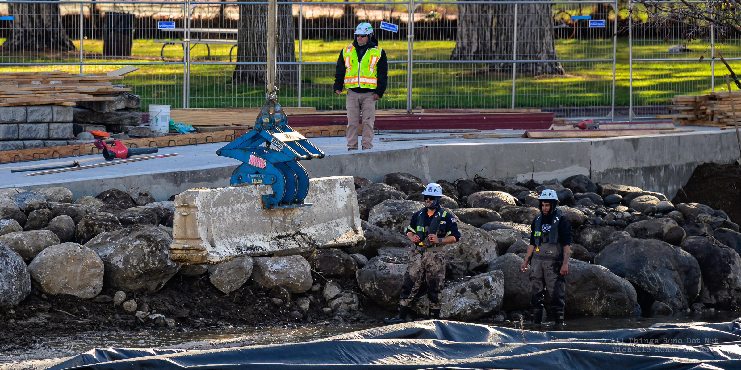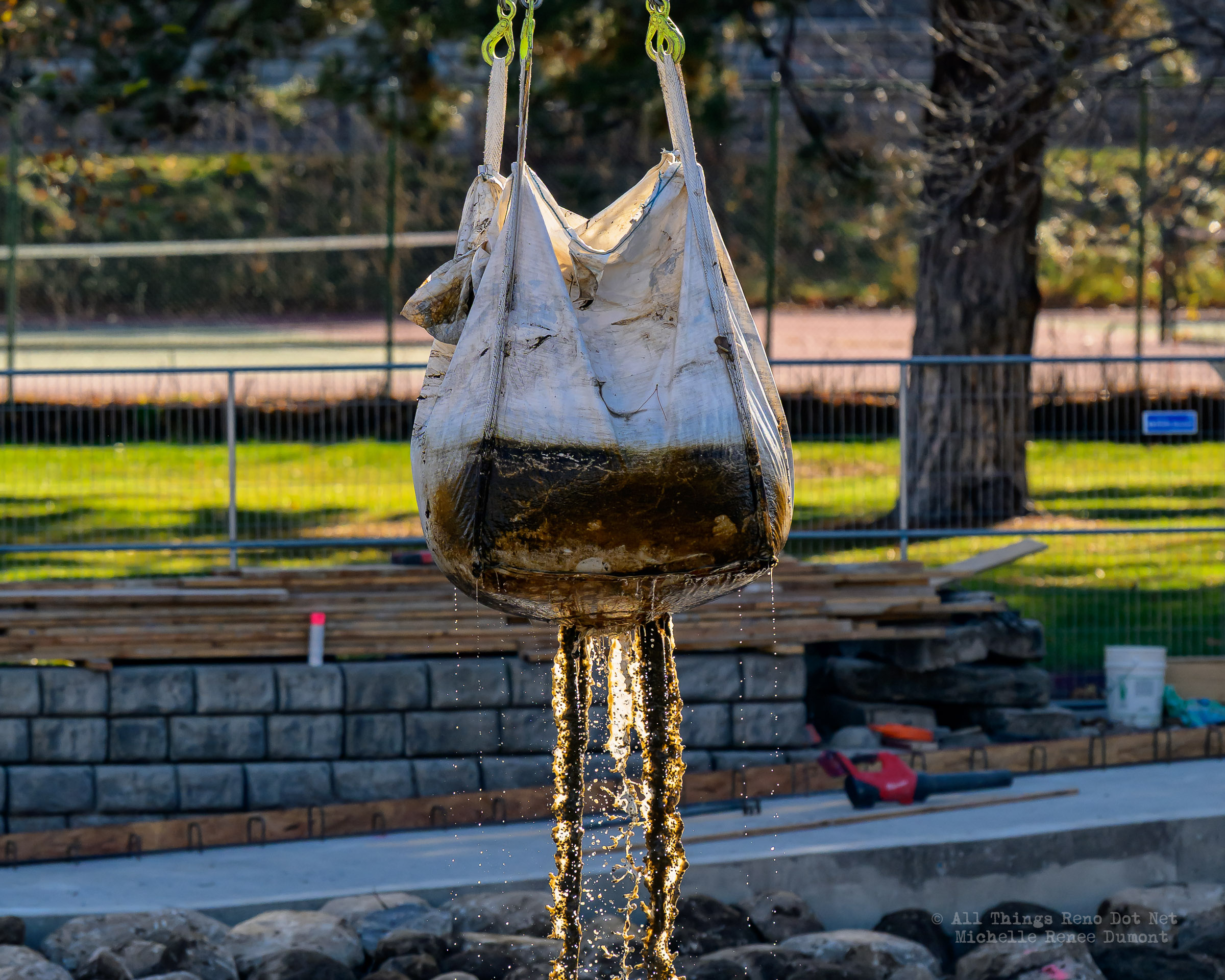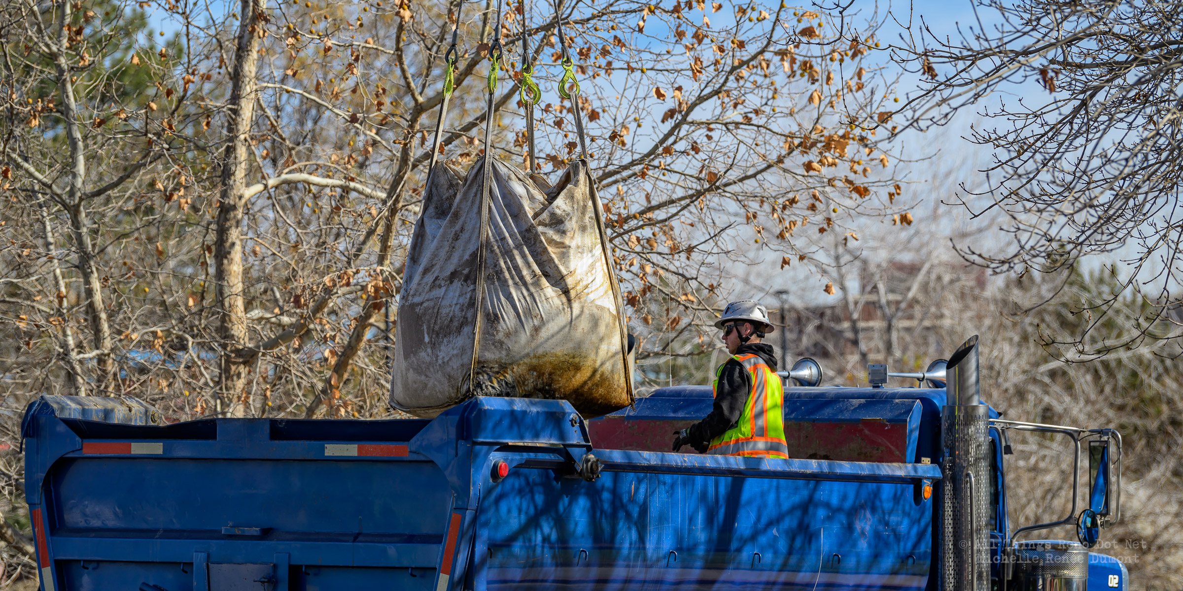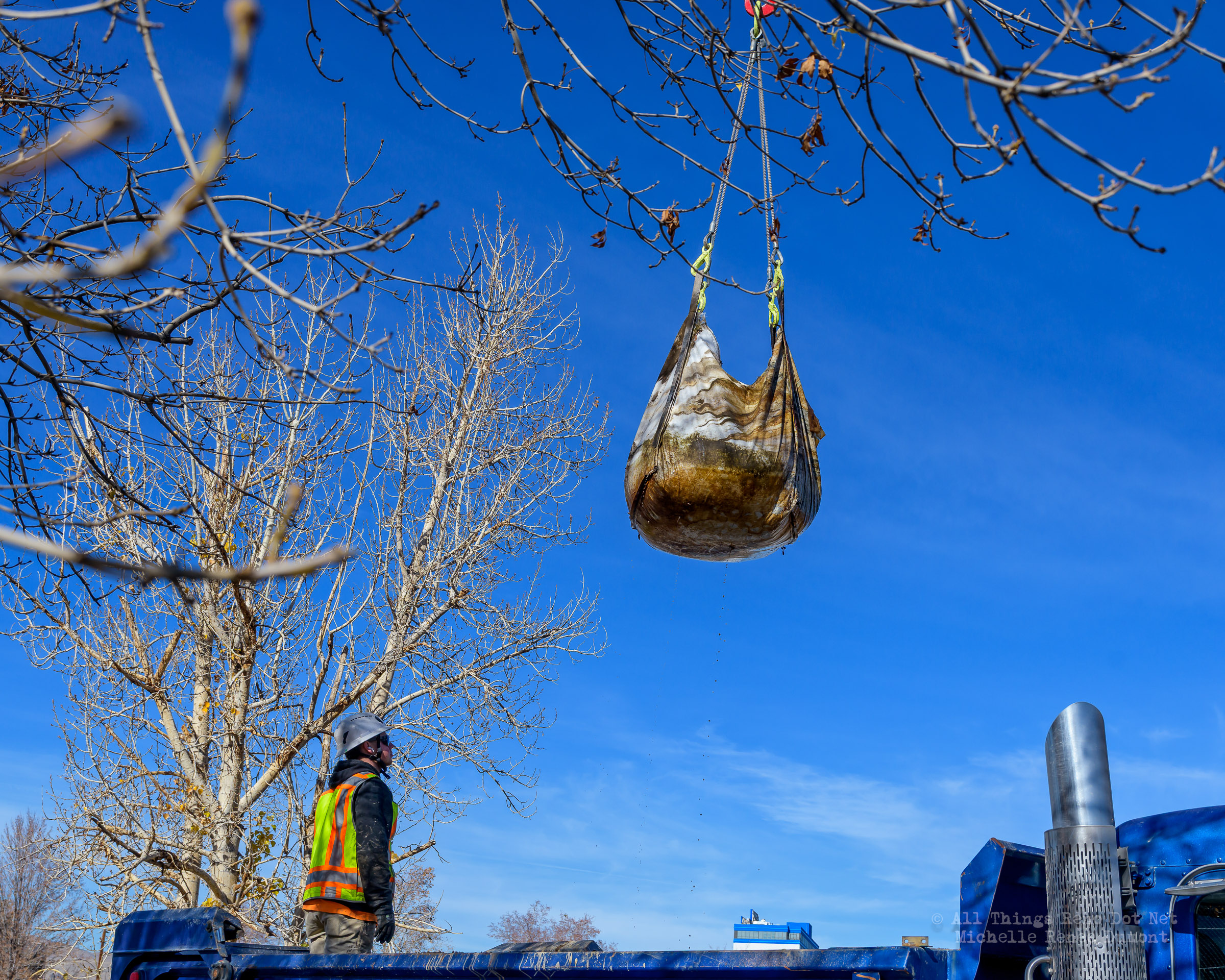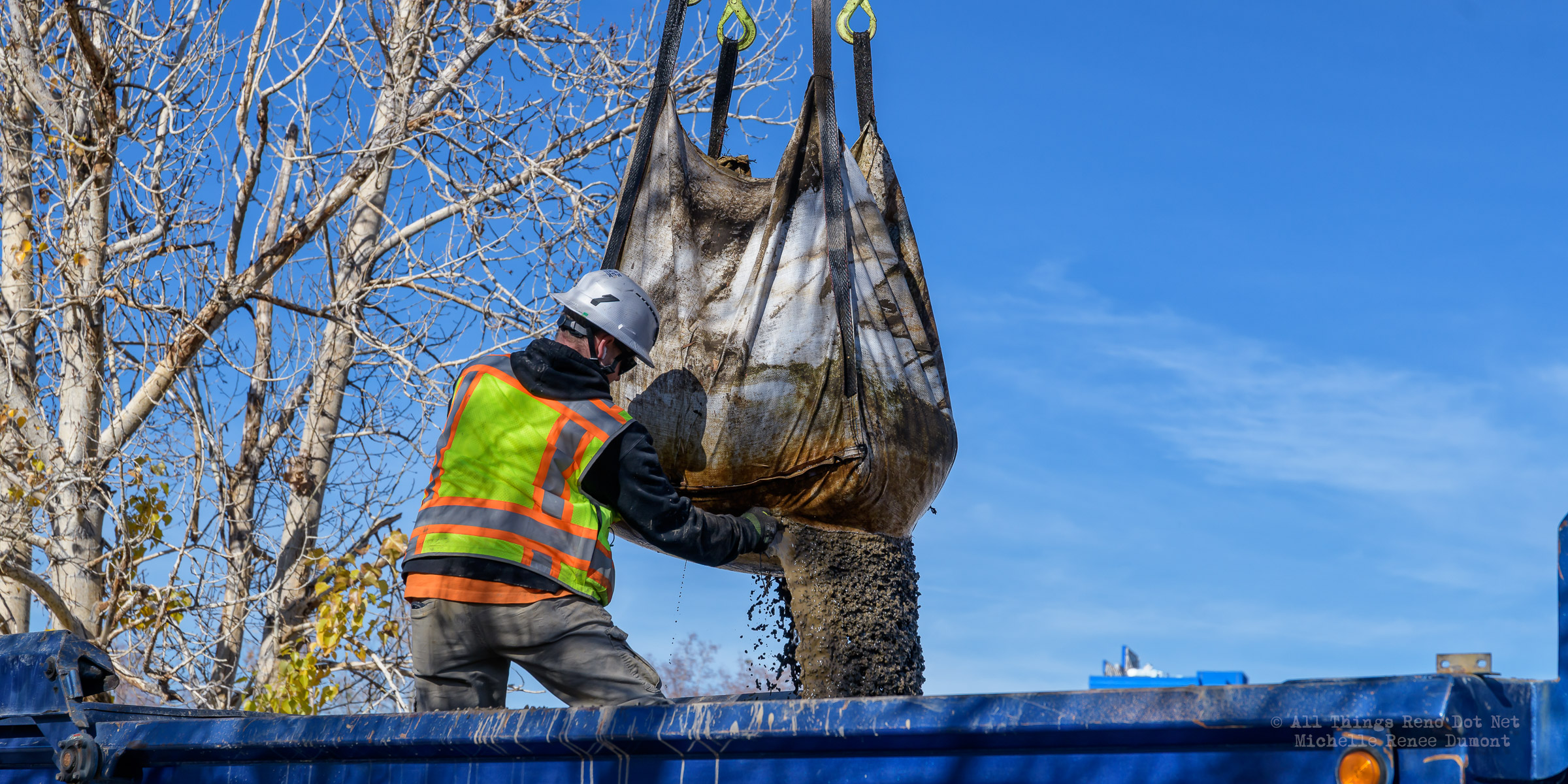 The process of removing the Aqua Dam to reopen the river has begun. Work on the Boat Ramp continued while a crew was, with the aid of a crane, removing all the sand bags. One by one, each bag was lifted over to a dump truck where it was sliced open to remove the contents. Eventually the Aqua Dam bladder was slowly pulled over to the peninsula and probably discarded. Because I’m elderly (73) and after standing for 3+ hours without a break, I wasn’t there to witness the big finale. But I’m sure it was executed perfectly without me.