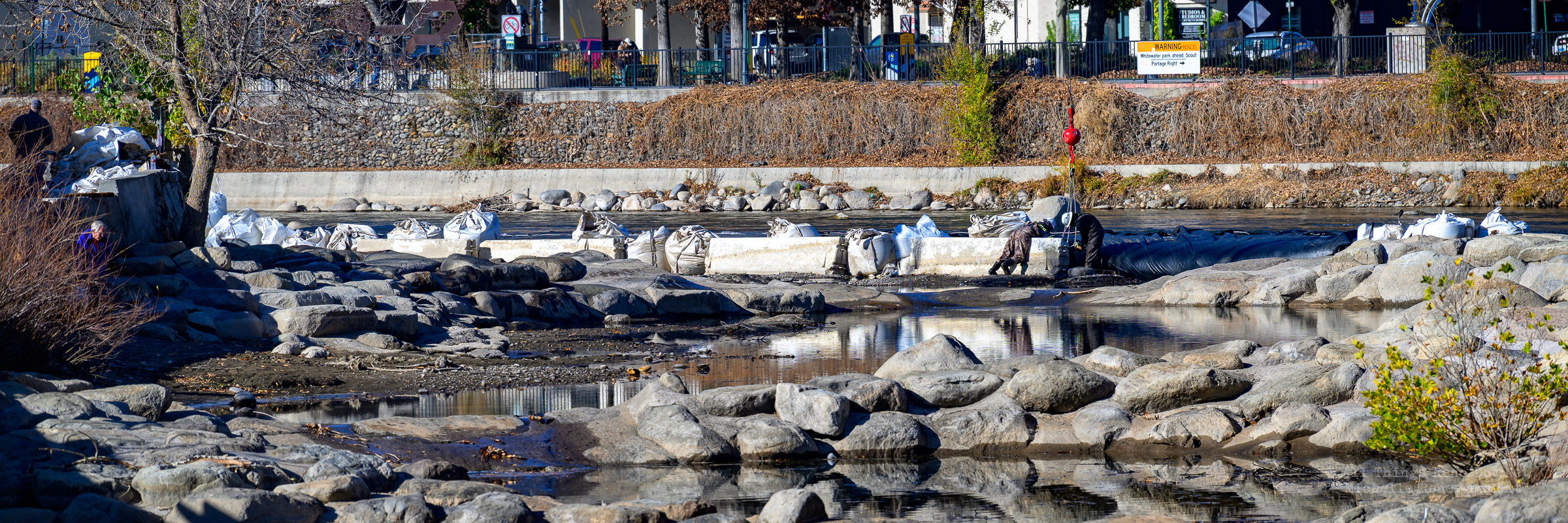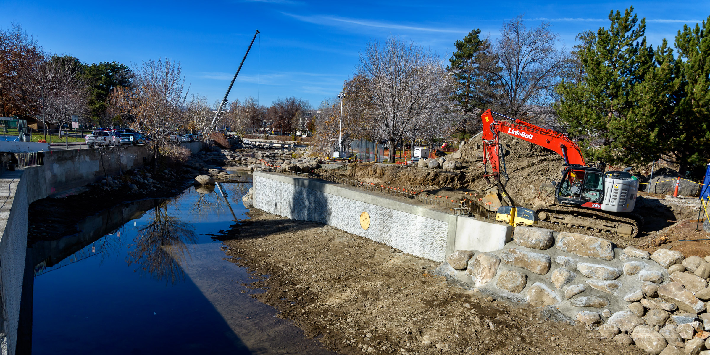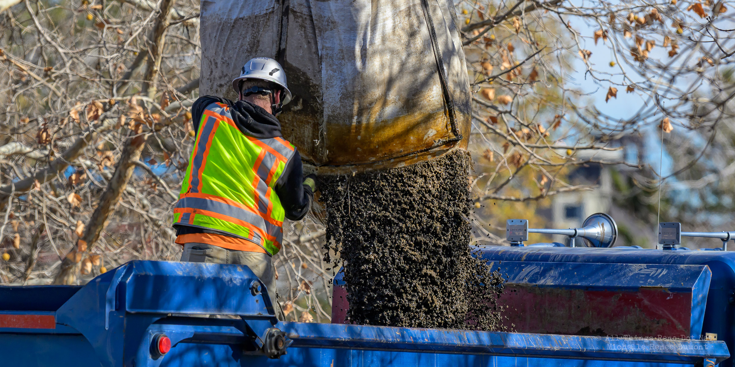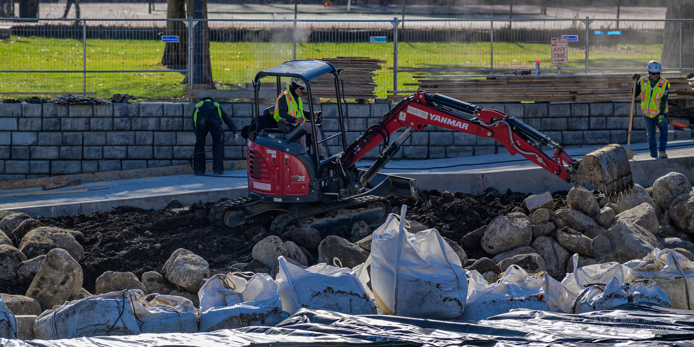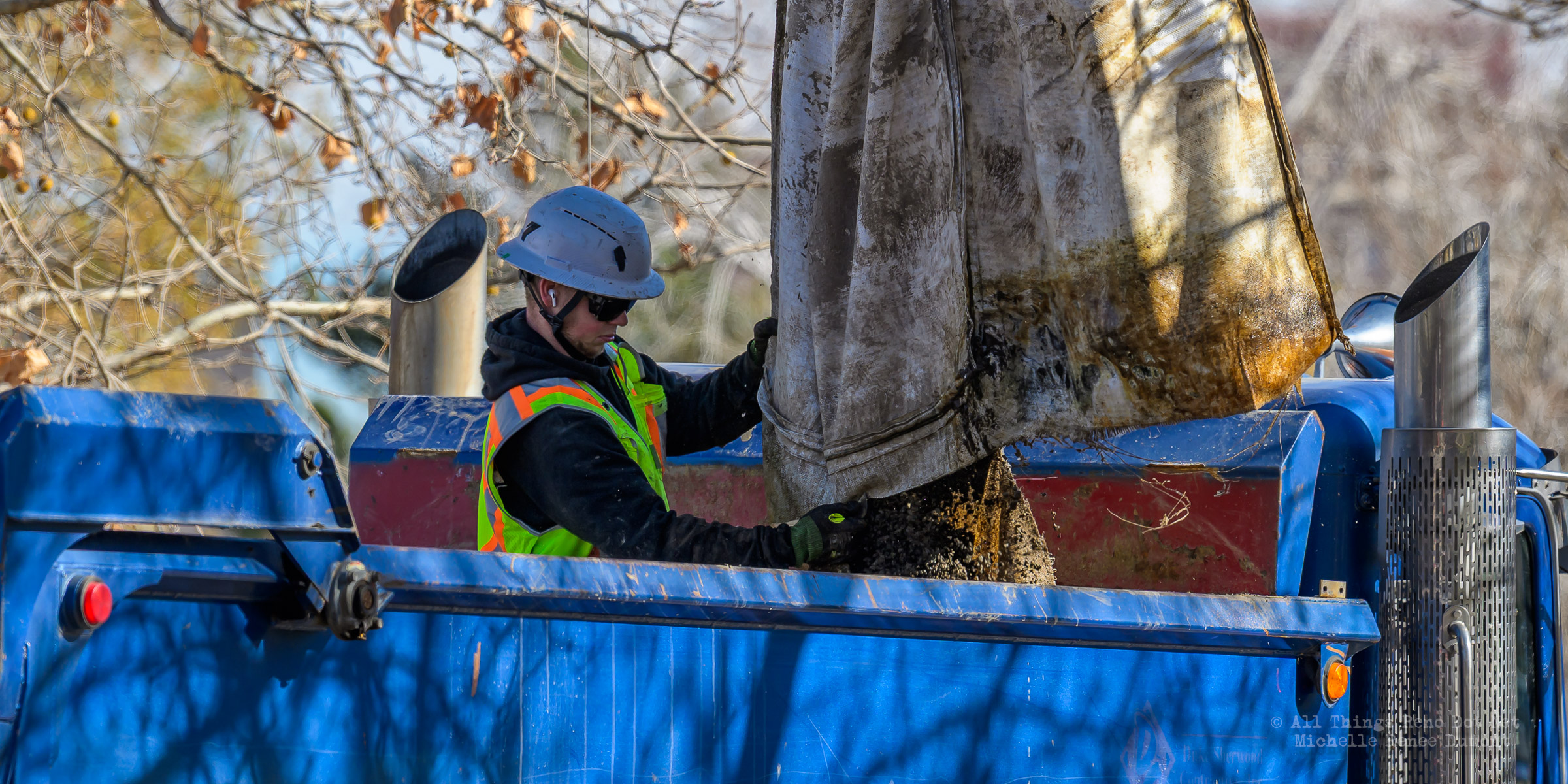 The process of removing the Aqua Dam to reopen the river has begun. Work on the Boat Ramp continued while a crew was, with the aid of a crane, removing all the sand bags. One by one, each bag was lifted over to a dump truck where it was sliced open to remove the contents. Eventually the Aqua Dam bladder was slowly pulled over to the peninsula and probably discarded. Because I’m elderly (73) and after standing for 3+ hours without a break, I wasn’t there to witness the big finale. But I’m sure it was executed perfectly without me.