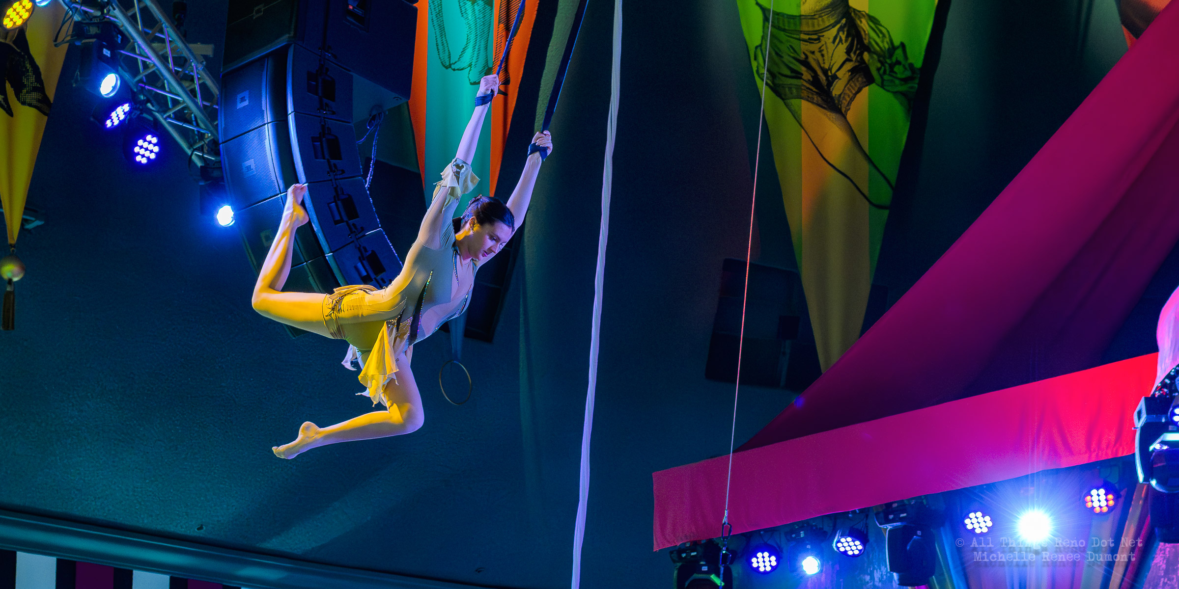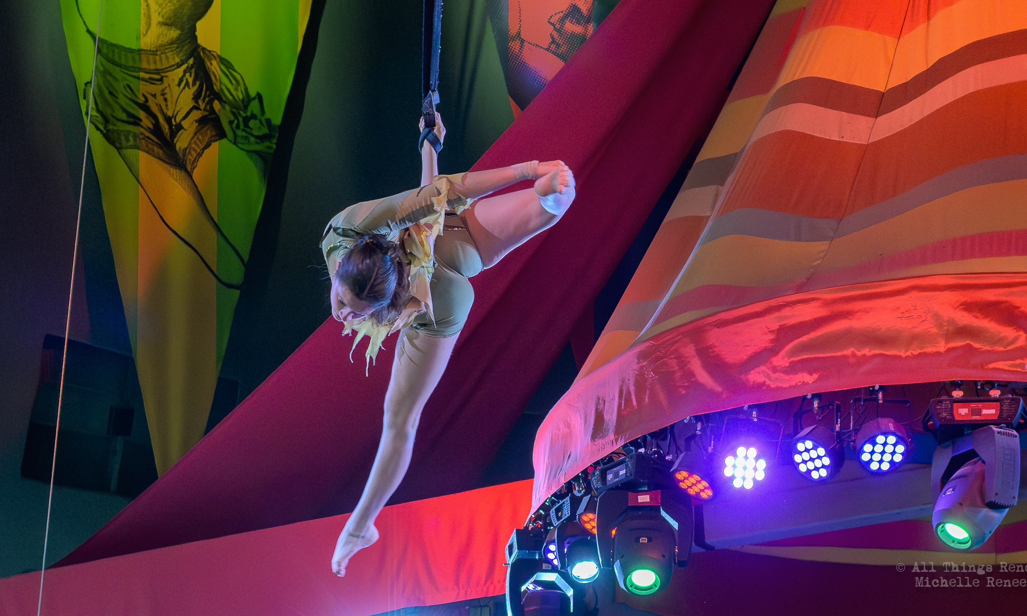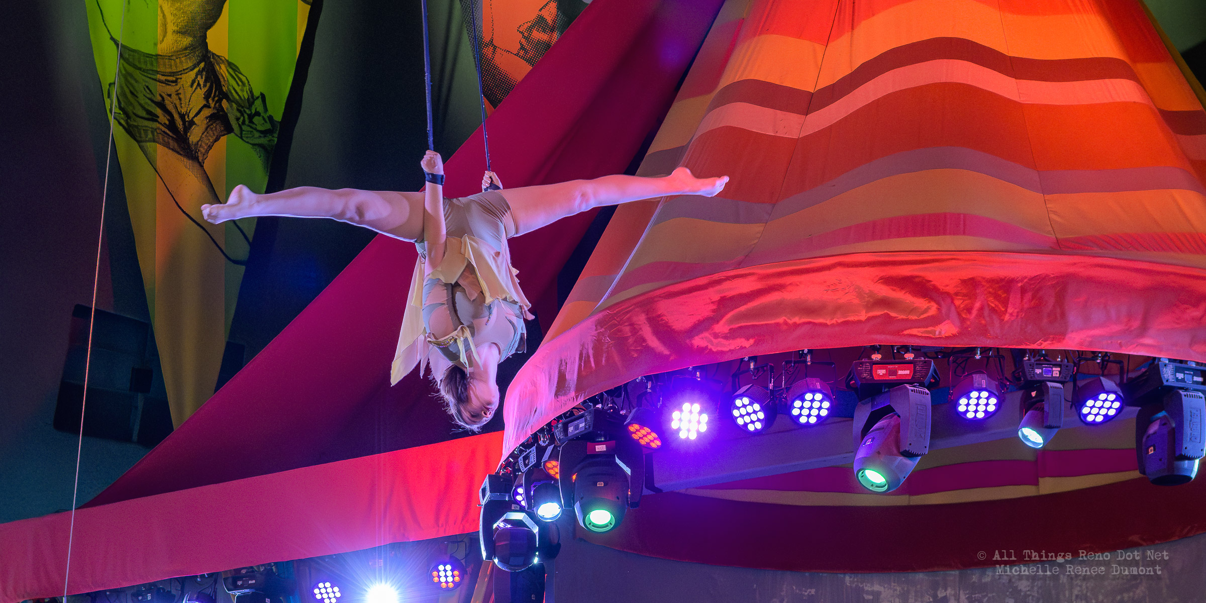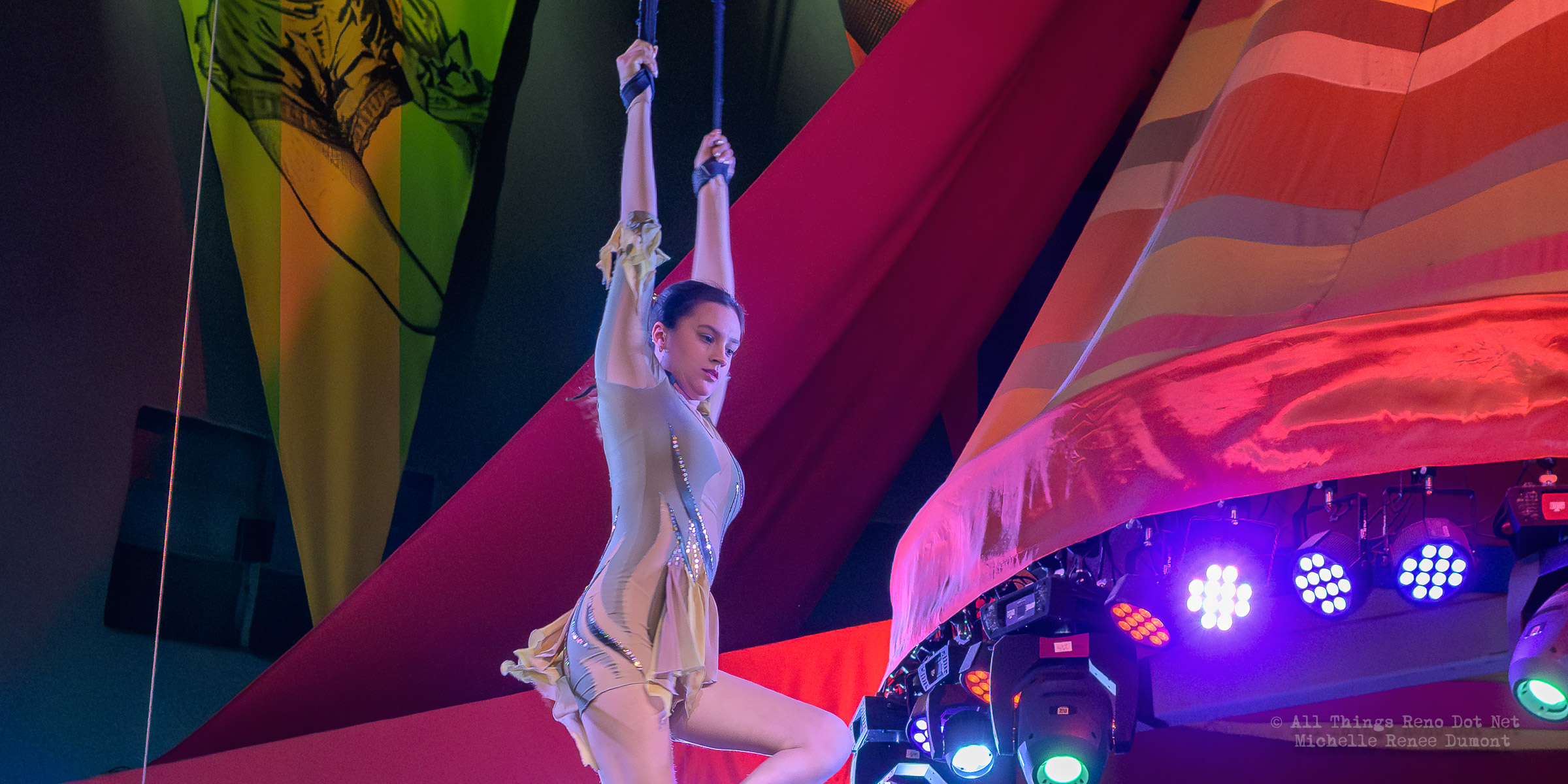 This performer has been here before. I’m guessing, she works with the Cirque du Soleil troop because her act involves giant swings across the stage ala Cirque, while contorting herself from those straps. She’s a very serious performer, never cracking a smile during her entire performance, even while taking her bow at the end.