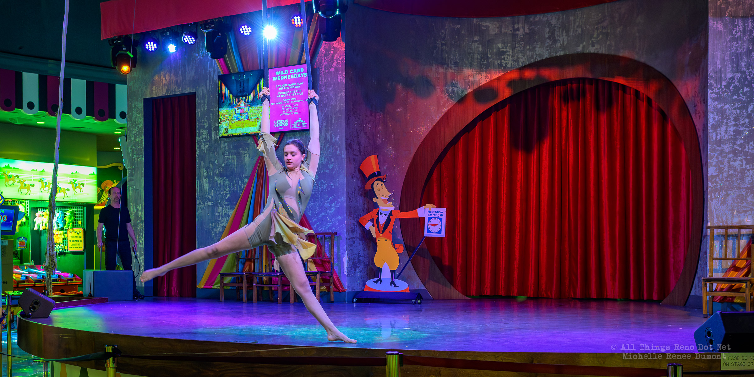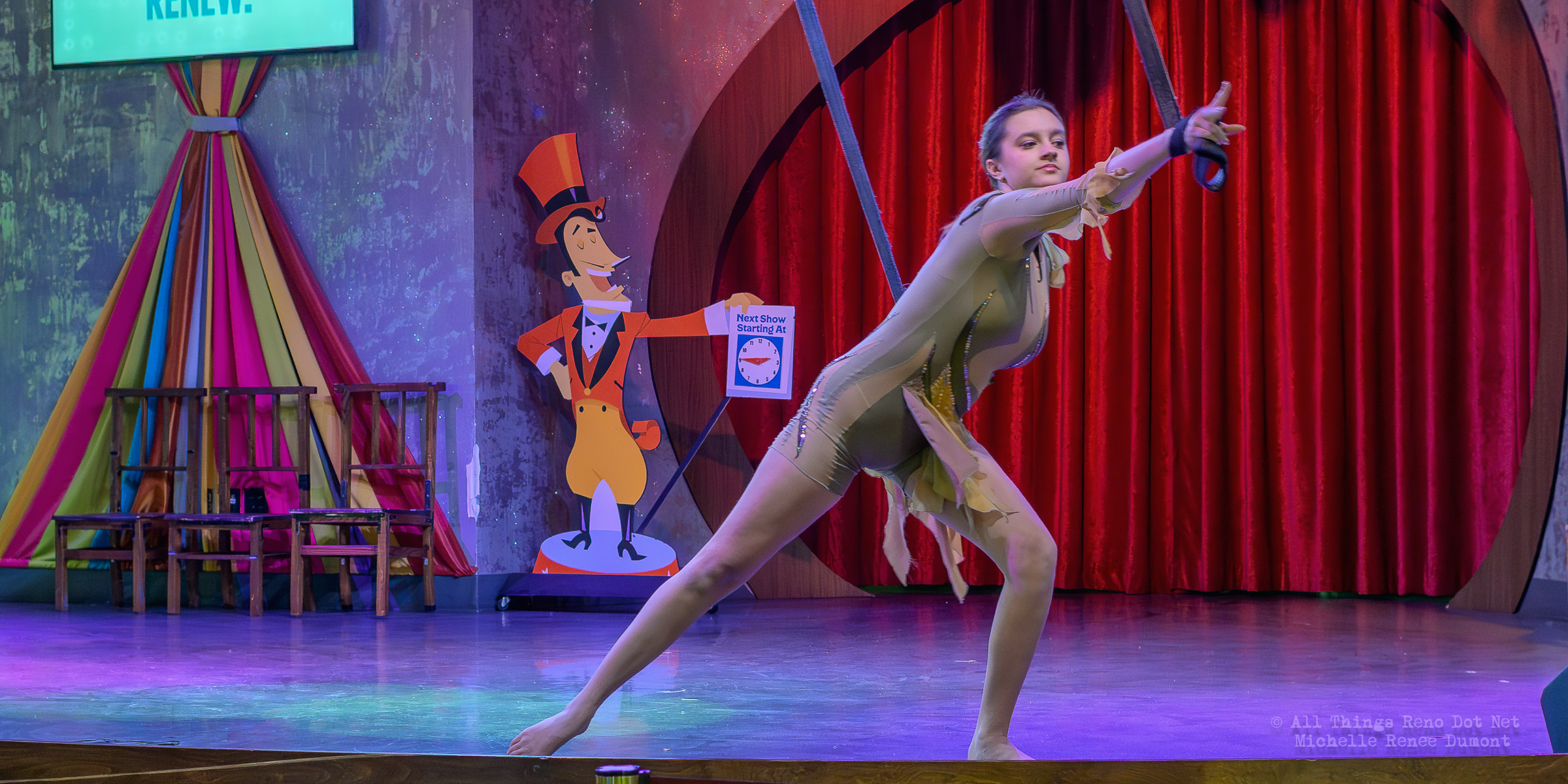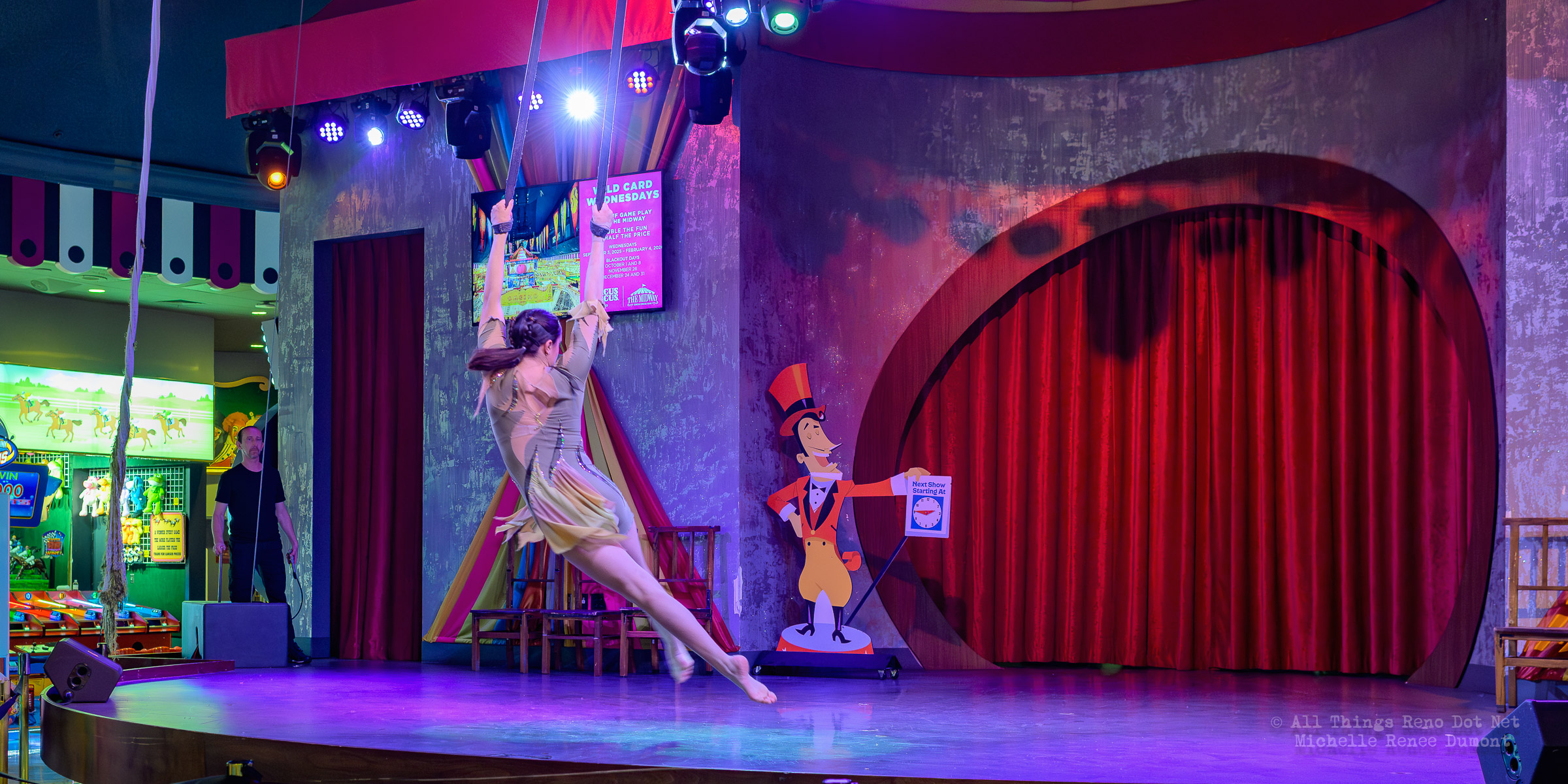 This performer has been here before. I’m guessing, she works with the Cirque du Soleil troop because her act involves giant swings across the stage ala Cirque, while contorting herself from those straps. She’s a very serious performer, never cracking a smile during her entire performance, even while taking her bow at the end.