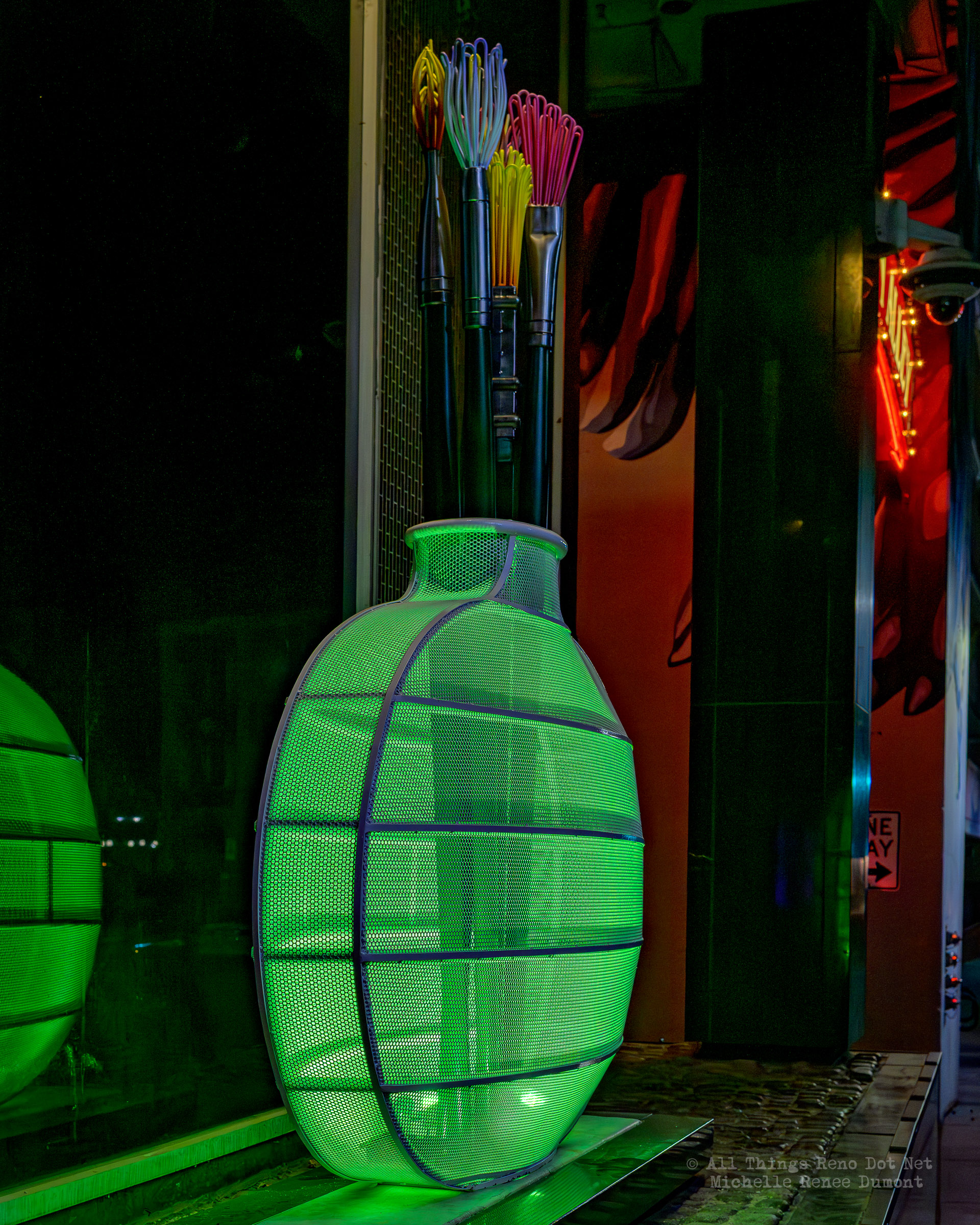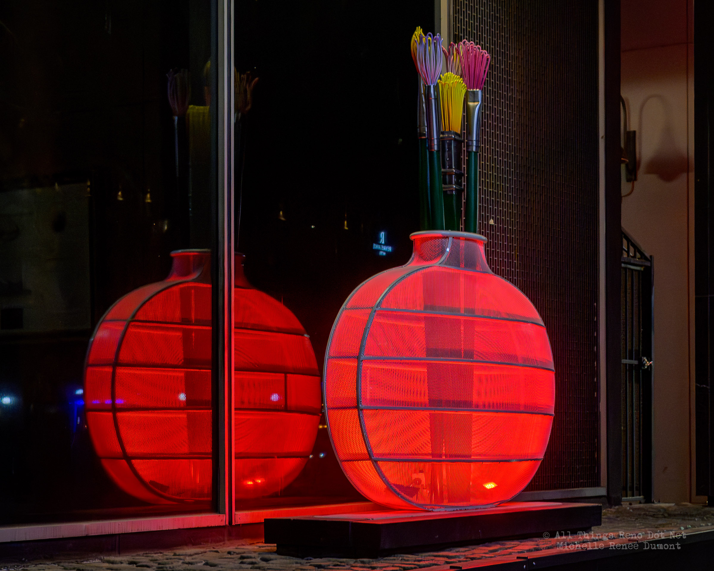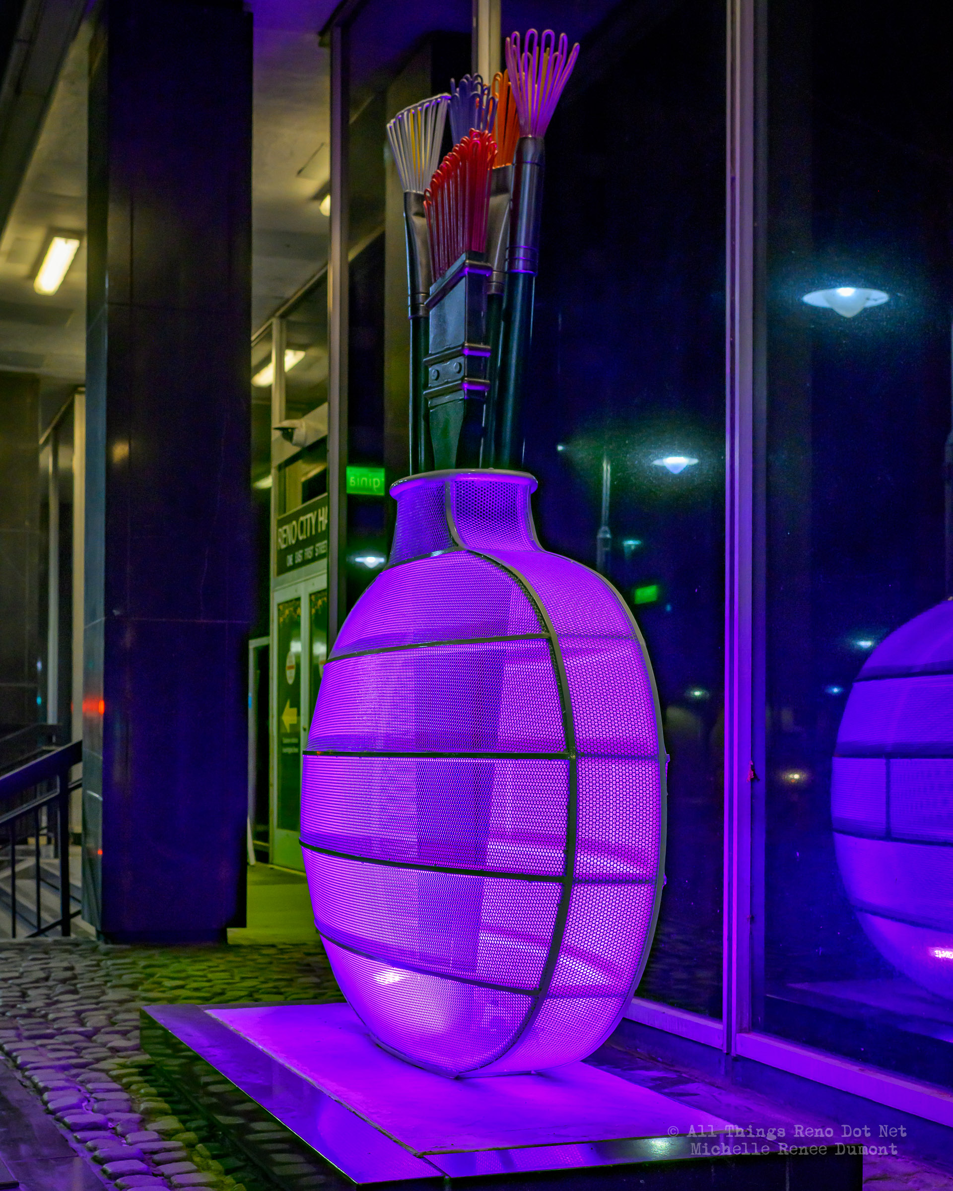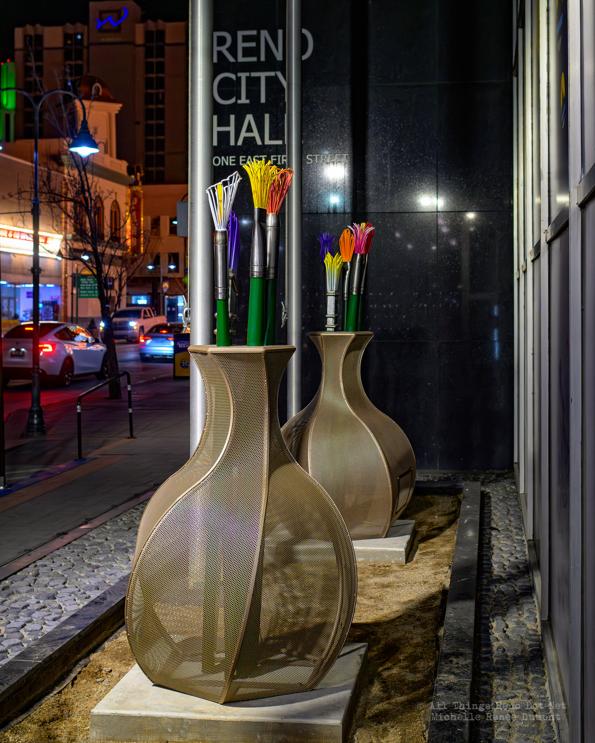 Reno City Hall is displaying a new art exhibit on the perimeter of the building. Vases with paint brushes. I thought maybe they would light up at night, but…