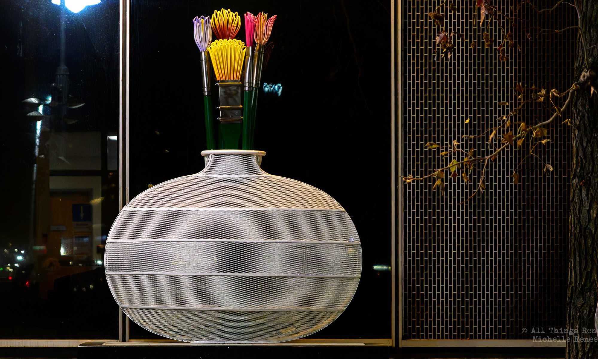 Reno City Hall is displaying a new art exhibit on the perimeter of the building. Vases with paint brushes. I thought maybe they would light up at night, but…