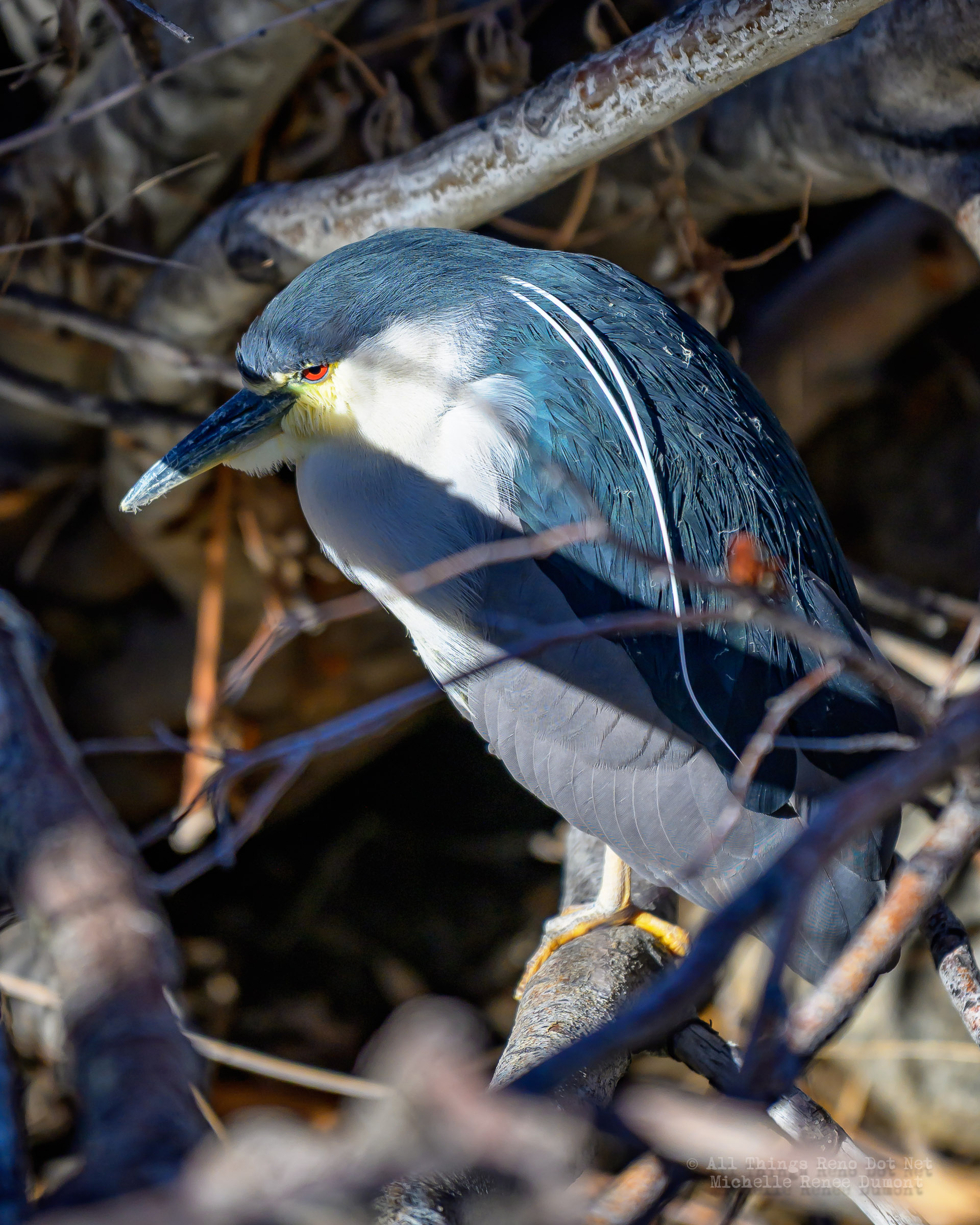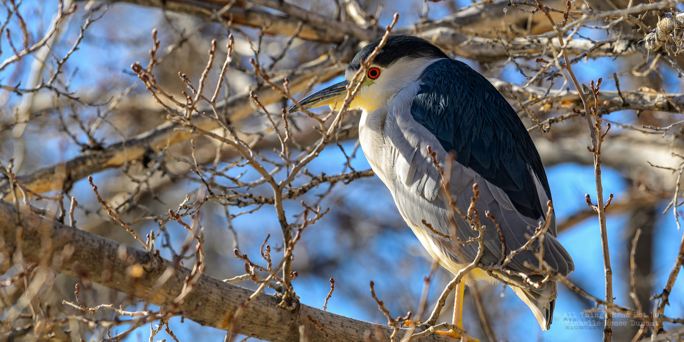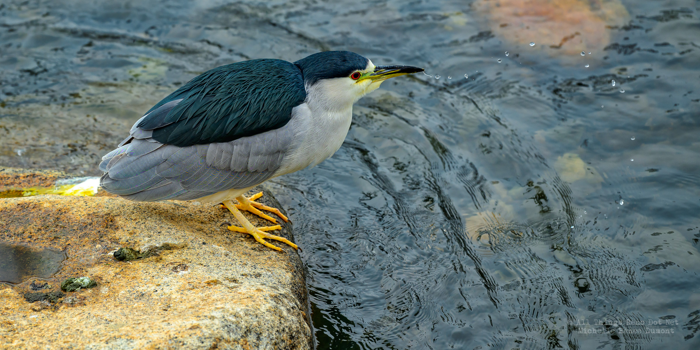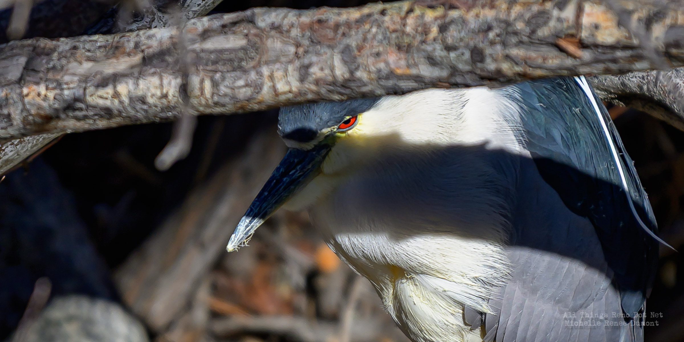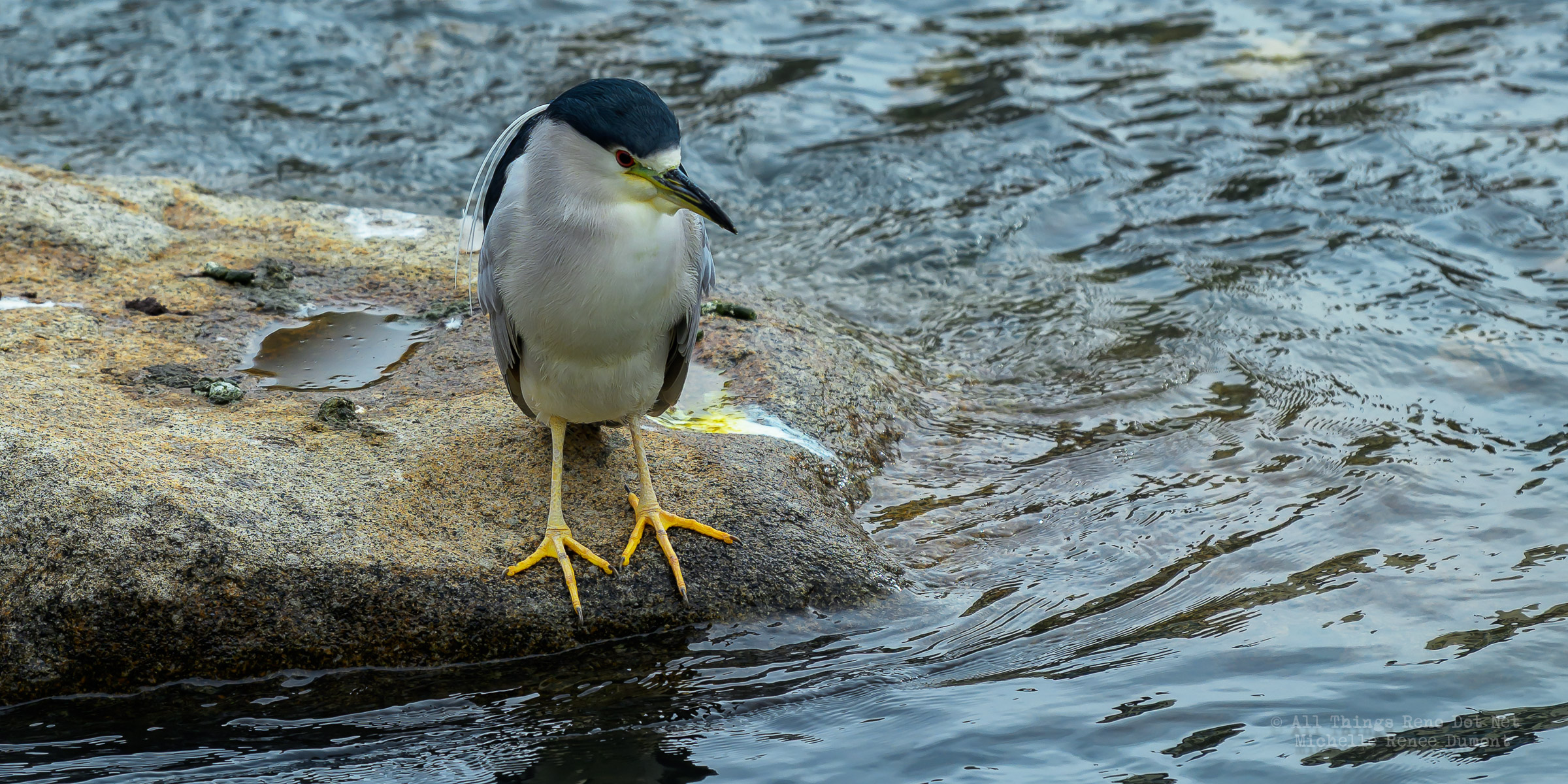 Very rarely do these birds venture out during the daylight hours searching for food. They are usually hiding among the branches of a tree, safe from the prying eyes and lethal claws of our resident Red Tailed Hawk. This is the second time I’ve witnessed one on these steps, hoping for crumbs from passersby who normally feed the ducks and geese, even though their main diet consists of small fish. I’ve been photographing these guys for several years now and always tend to fascinate me with those red eyes.