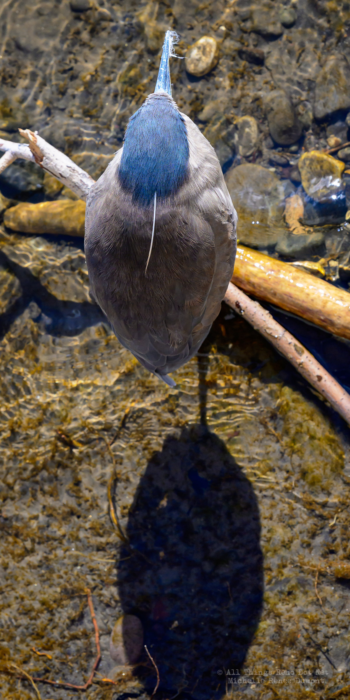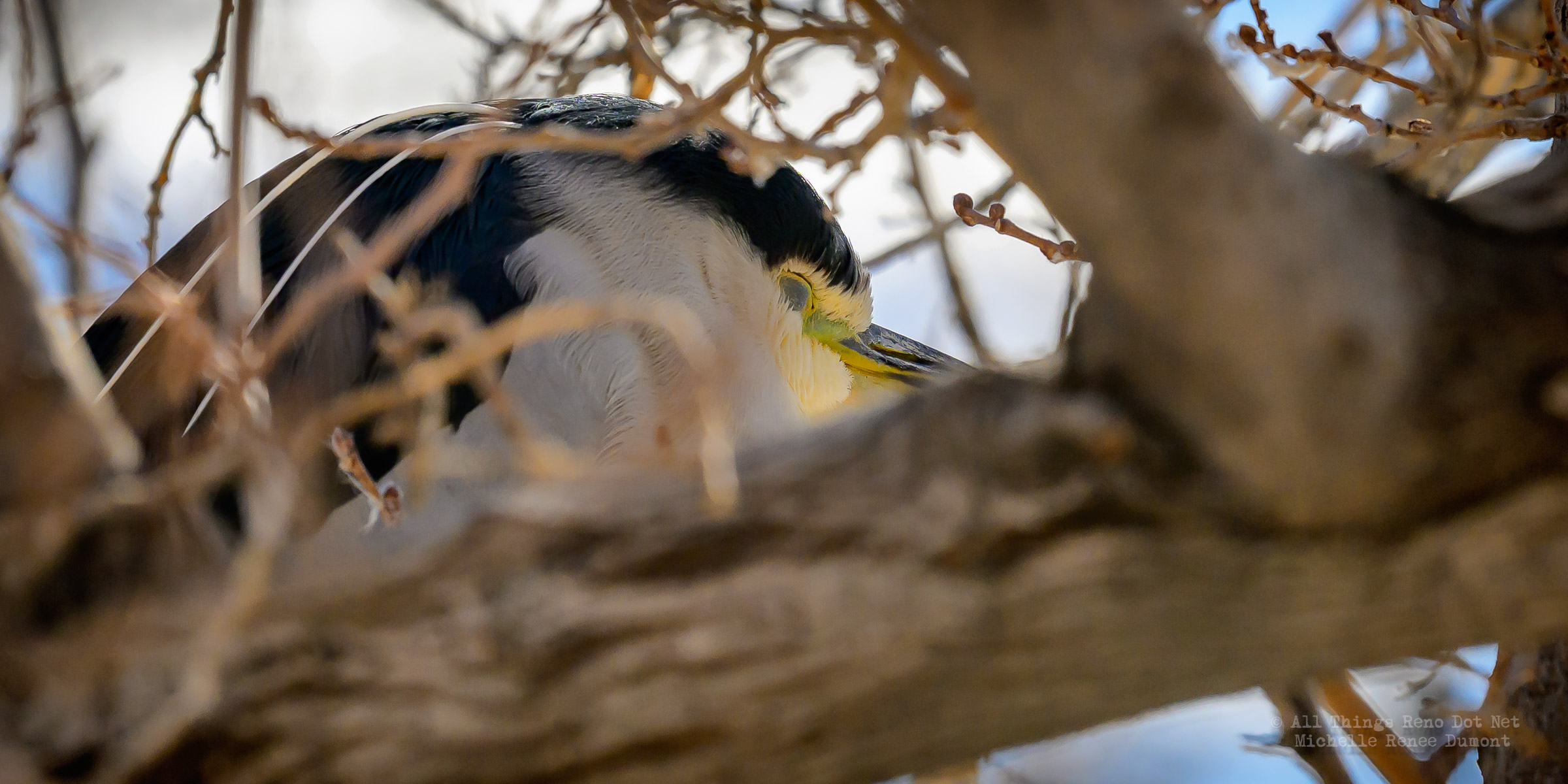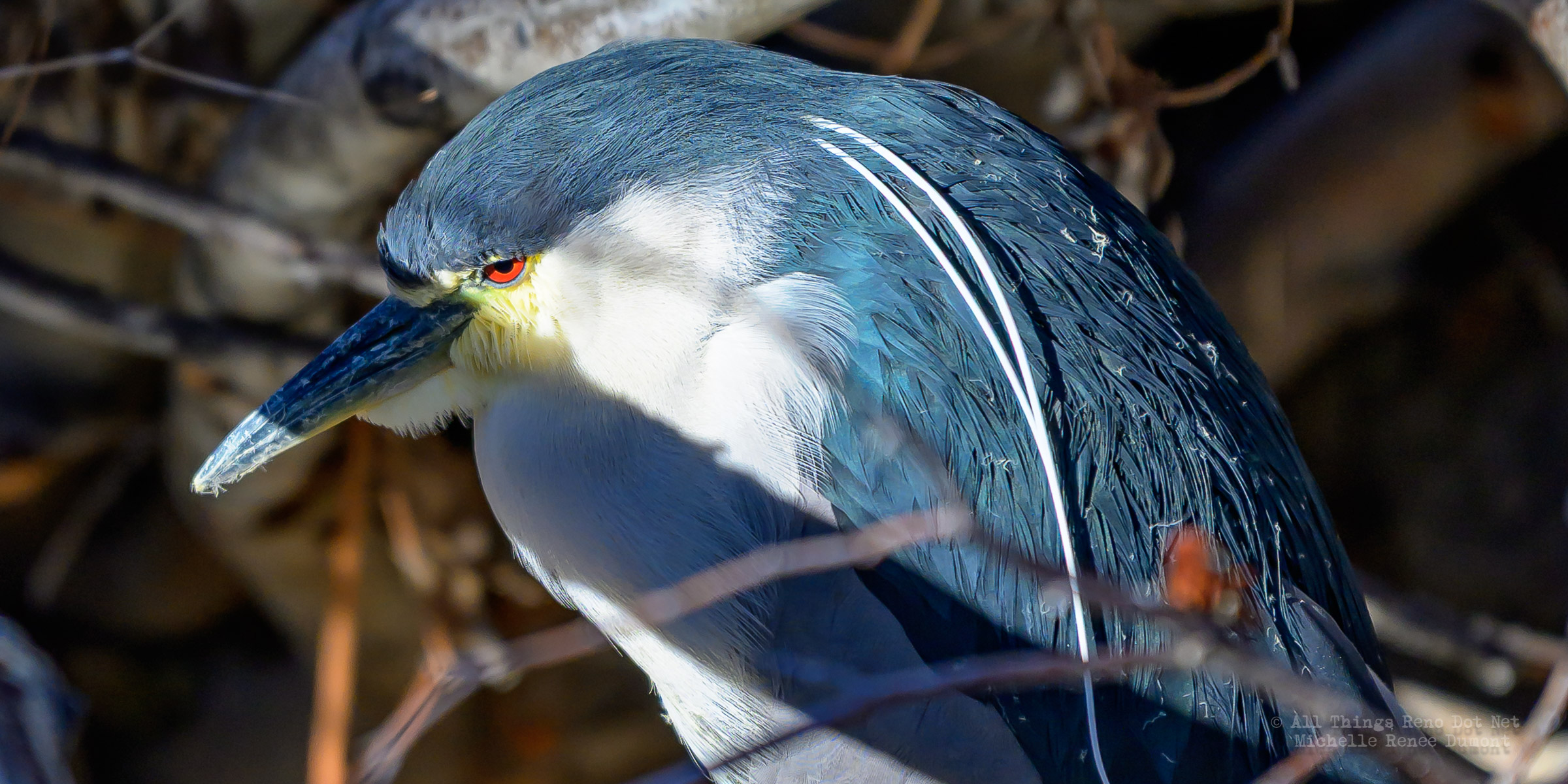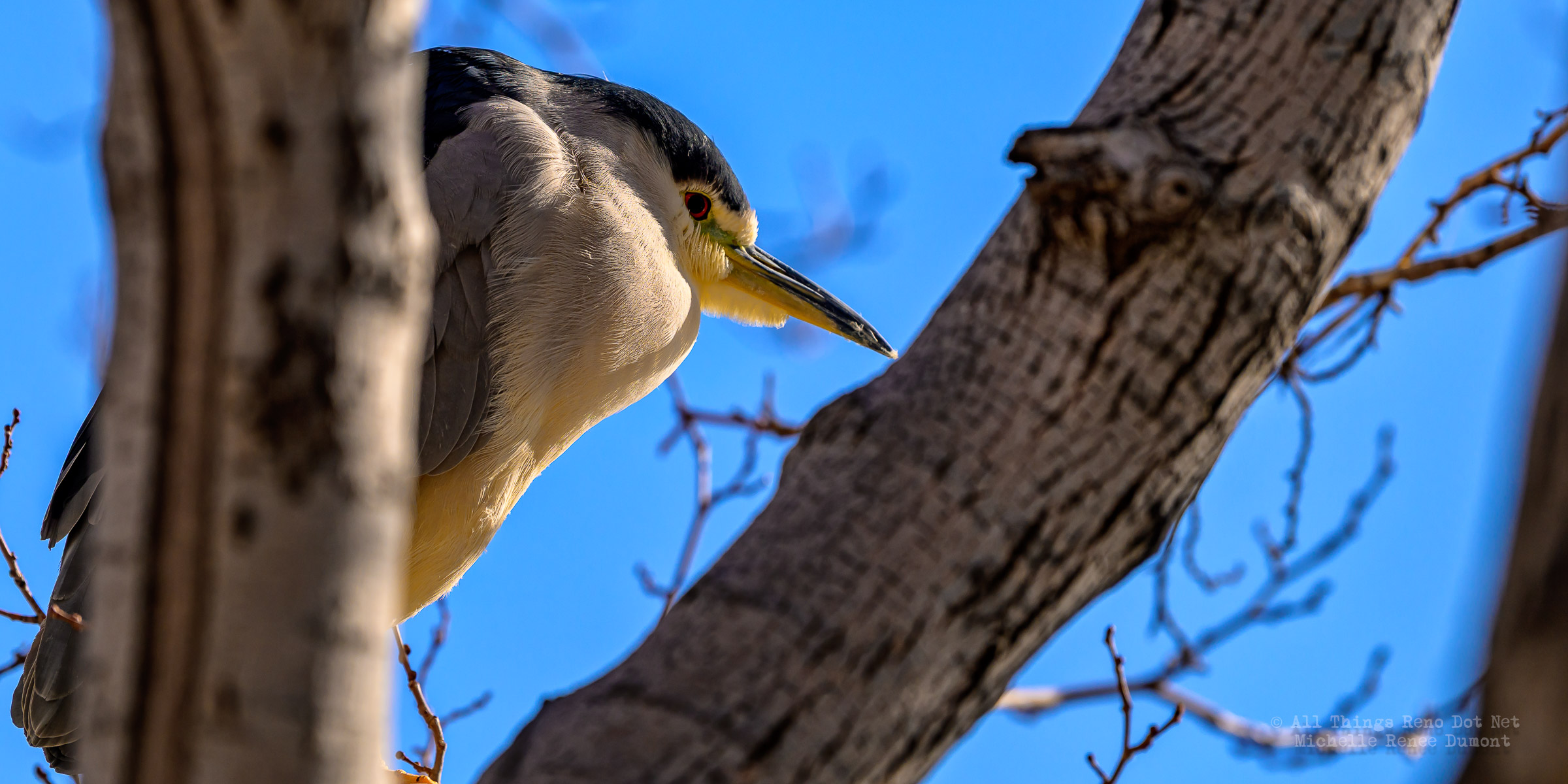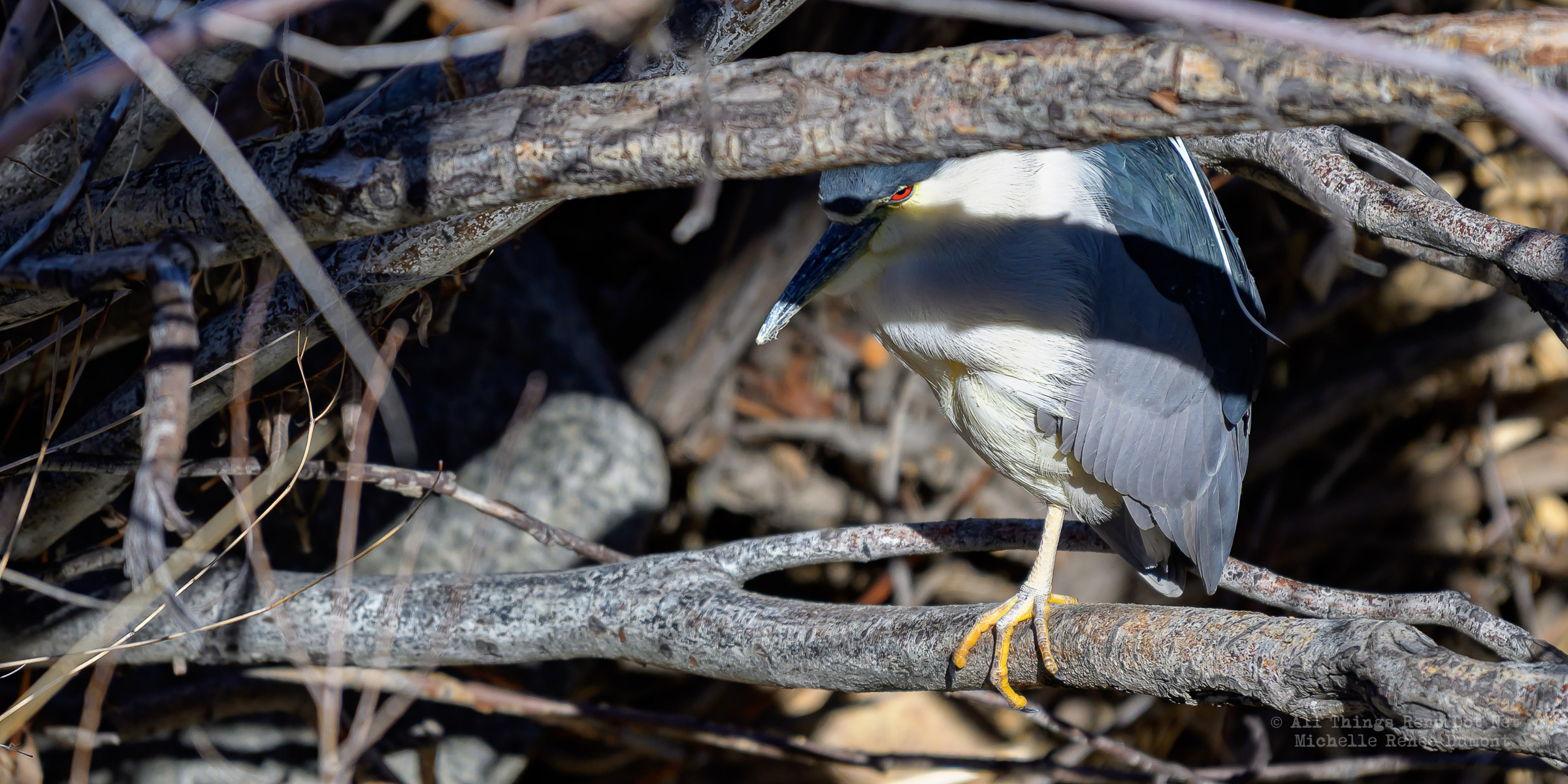Very rarely do these birds venture out during the daylight hours searching for food. They are usually hiding among the branches of a tree, safe from the prying eyes and lethal claws of our resident Red Tailed Hawk. This is the second time I’ve witnessed one on these steps, hoping for crumbs from passersby who normally feed the ducks and geese, even though their main diet consists of small fish. I’ve been photographing these guys for several years now and always tend to fascinate me with those red eyes.