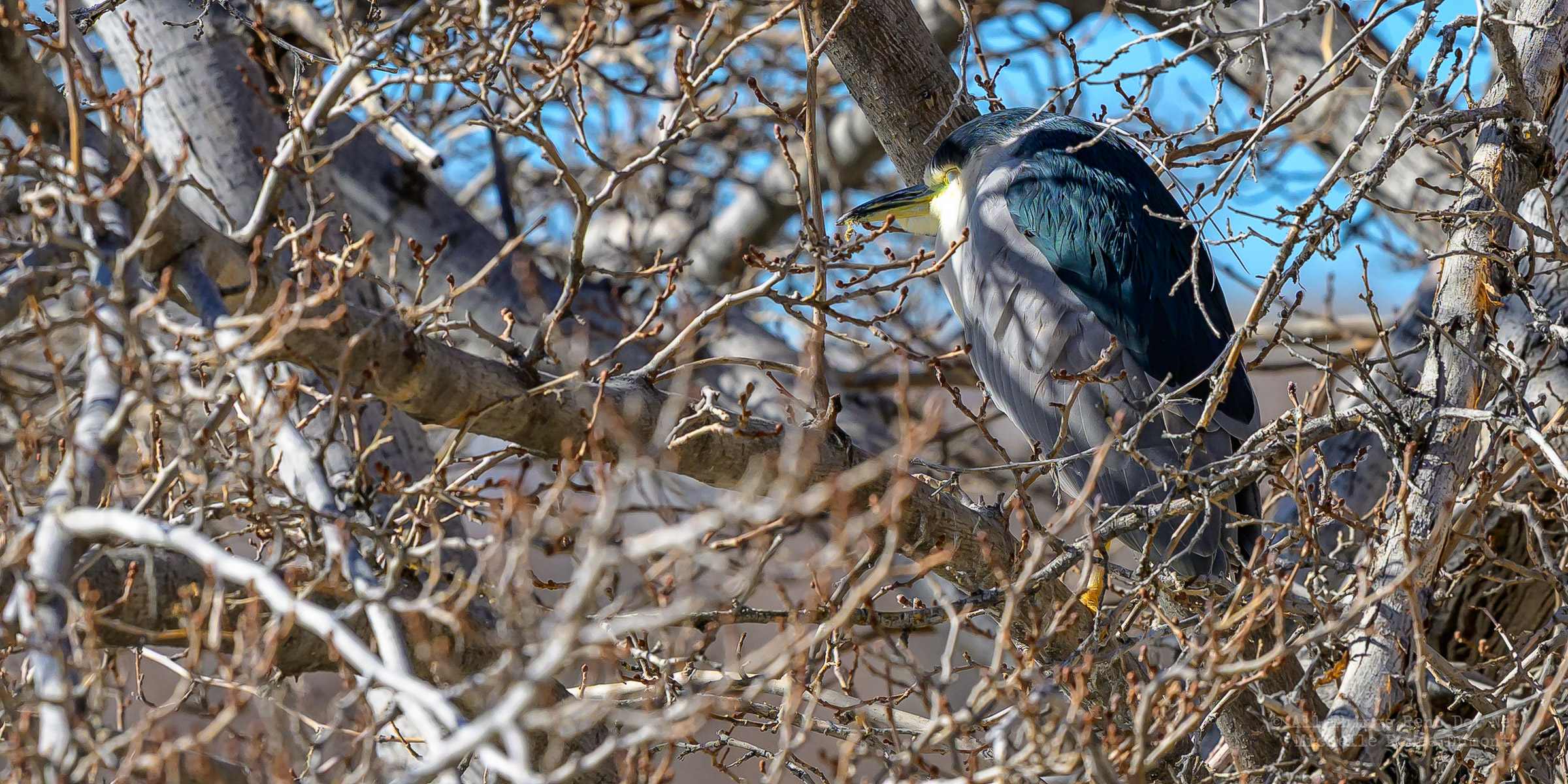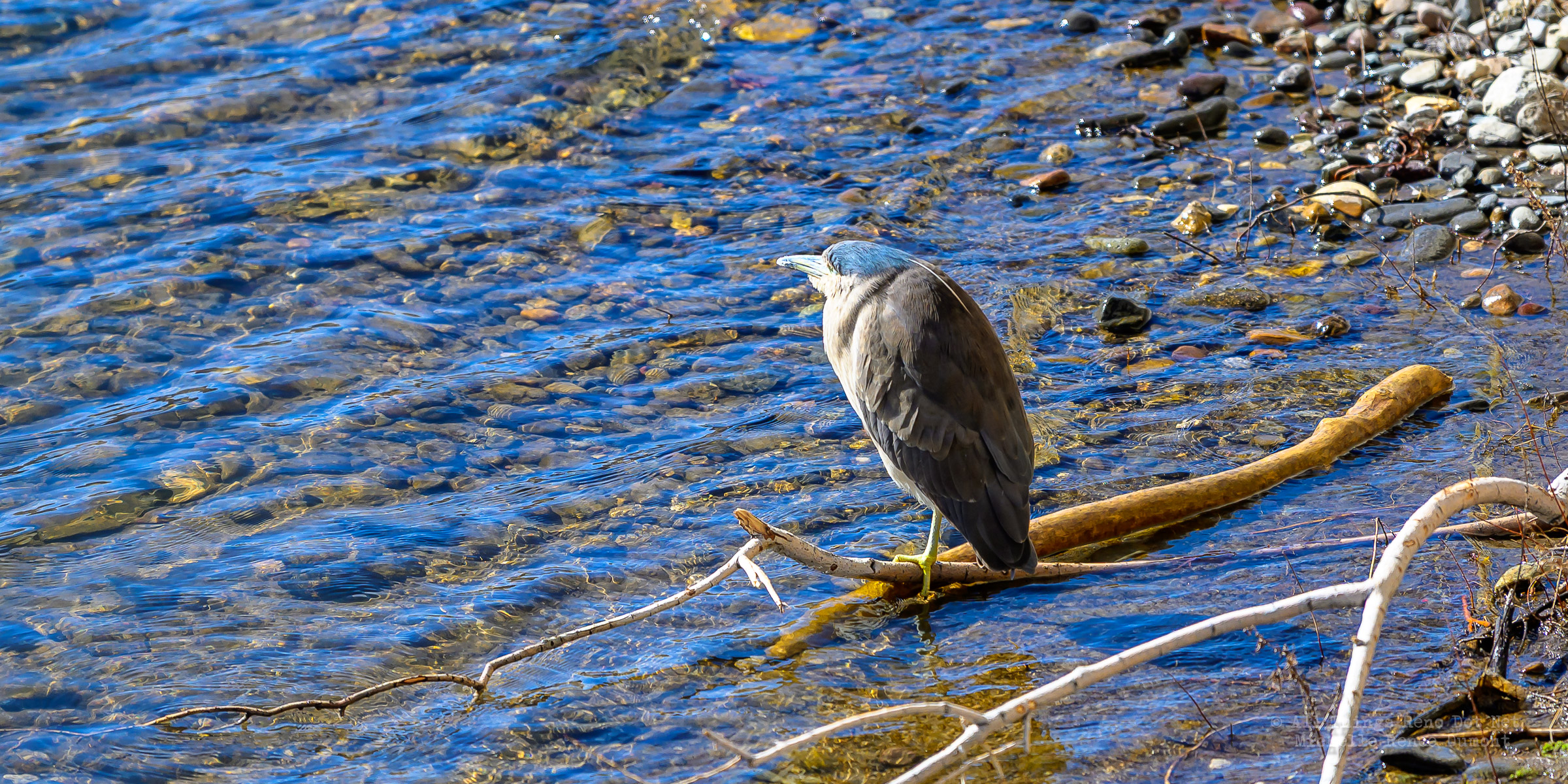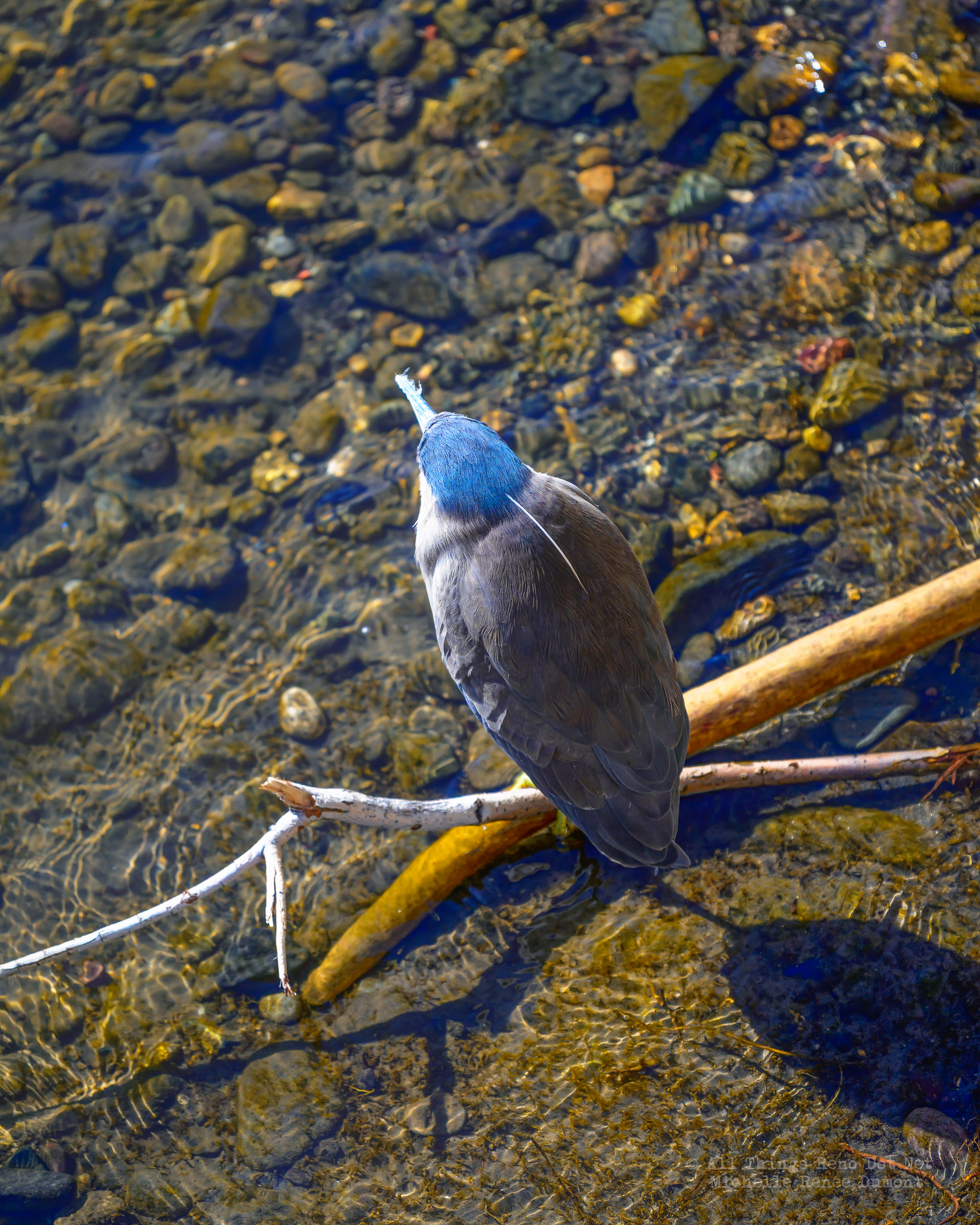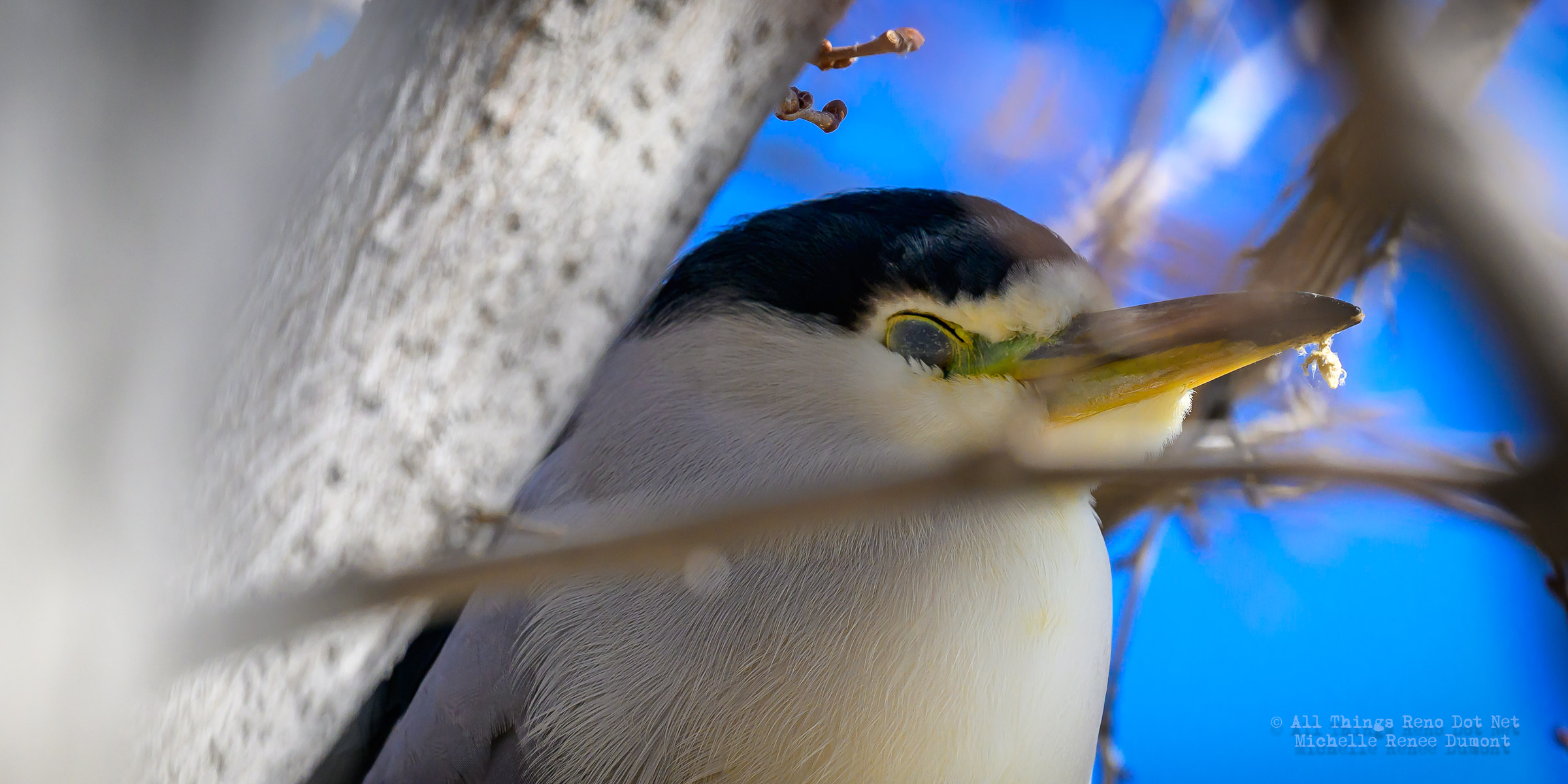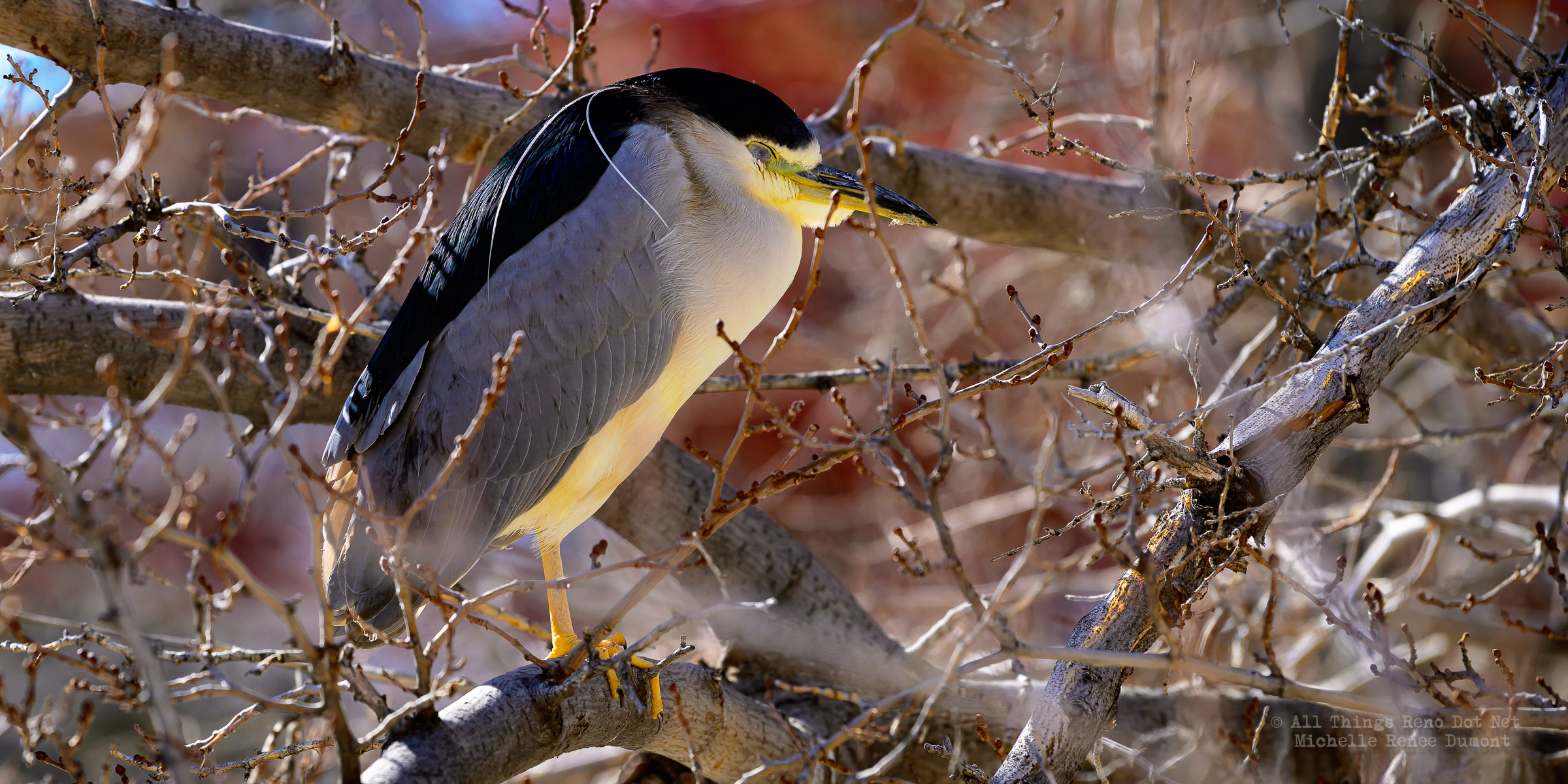 Very rarely do these birds venture out during the daylight hours searching for food. They are usually hiding among the branches of a tree, safe from the prying eyes and lethal claws of our resident Red Tailed Hawk. This is the second time I’ve witnessed one on these steps, hoping for crumbs from passersby who normally feed the ducks and geese, even though their main diet consists of small fish. I’ve been photographing these guys for several years now and always tend to fascinate me with those red eyes.