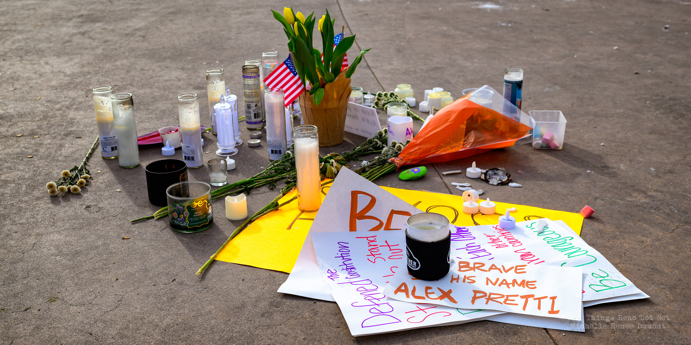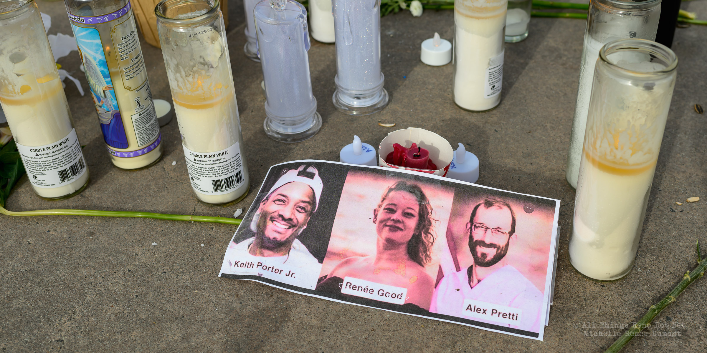 …on the downtown plaza on Saturday for Alex Pretti, Renee Good, and Keith Porter who were murdered by members of DHS in Minneapolis, MN while protesting tactics used by ICE agents. According to local News reports, a large crowd gathered in the evening to show their respect for the victims and disdain for those involved in the shootings