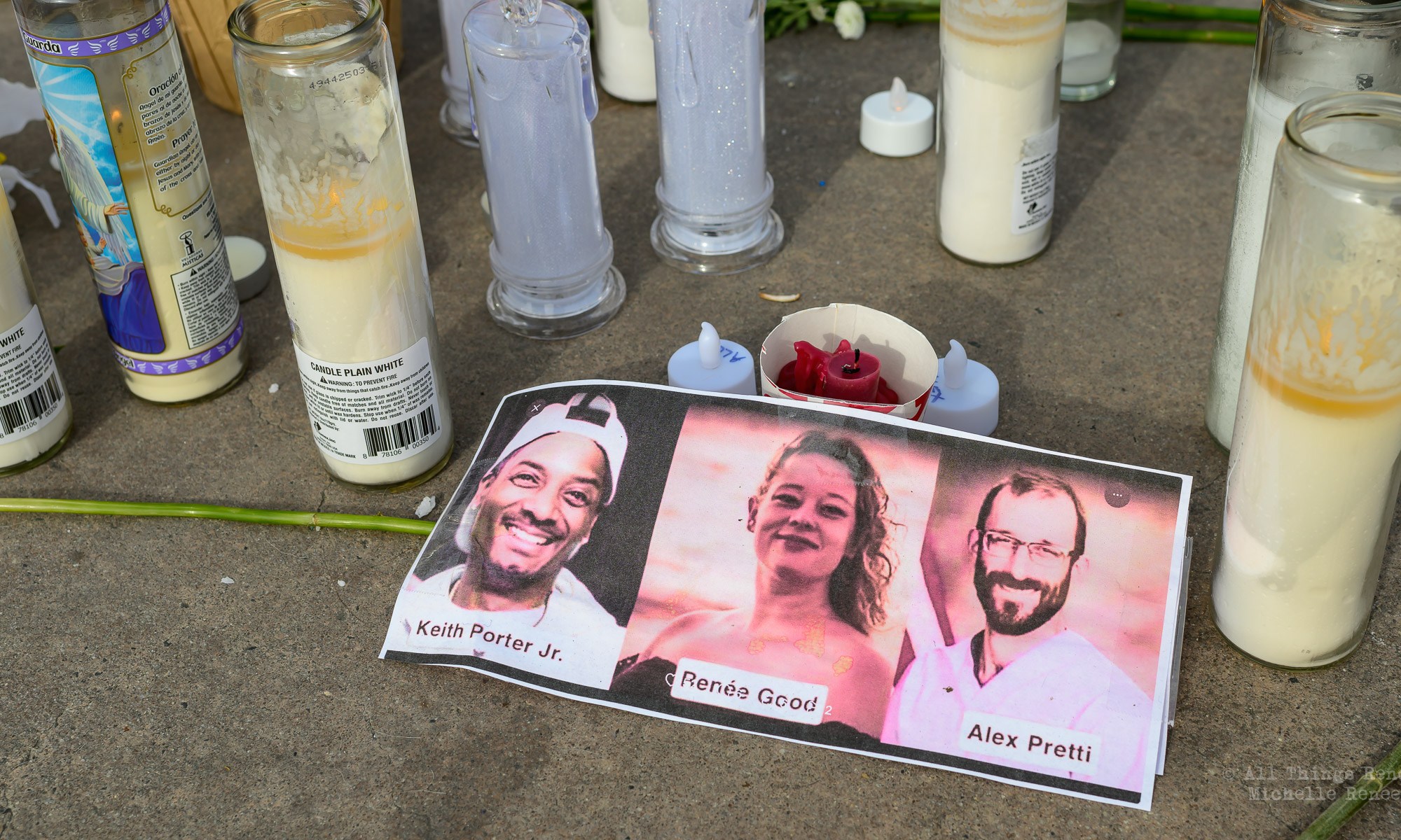 …on the downtown plaza on Saturday for Alex Pretti, Renee Good, and Keith Porter who were murdered by members of DHS in Minneapolis, MN while protesting tactics used by ICE agents. According to local News reports, a large crowd gathered in the evening to show their respect for the victims and disdain for those involved in the shootings