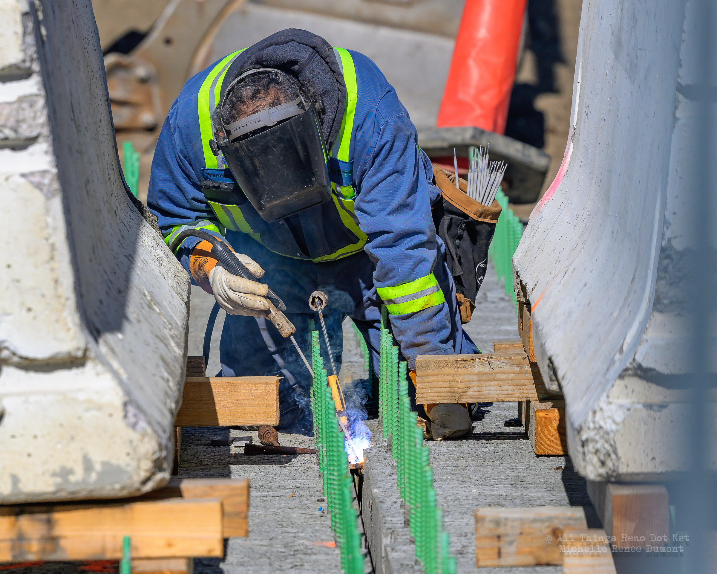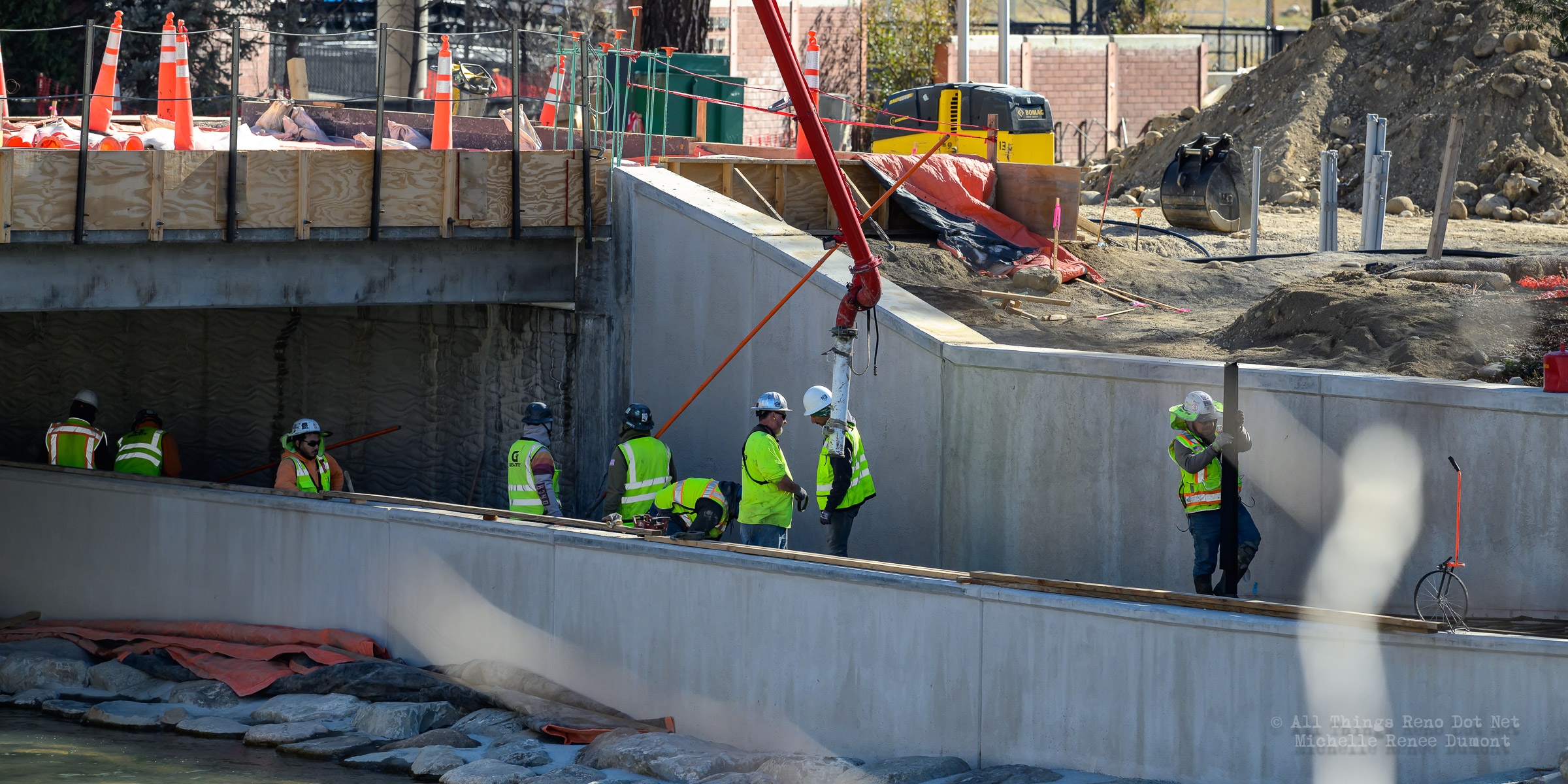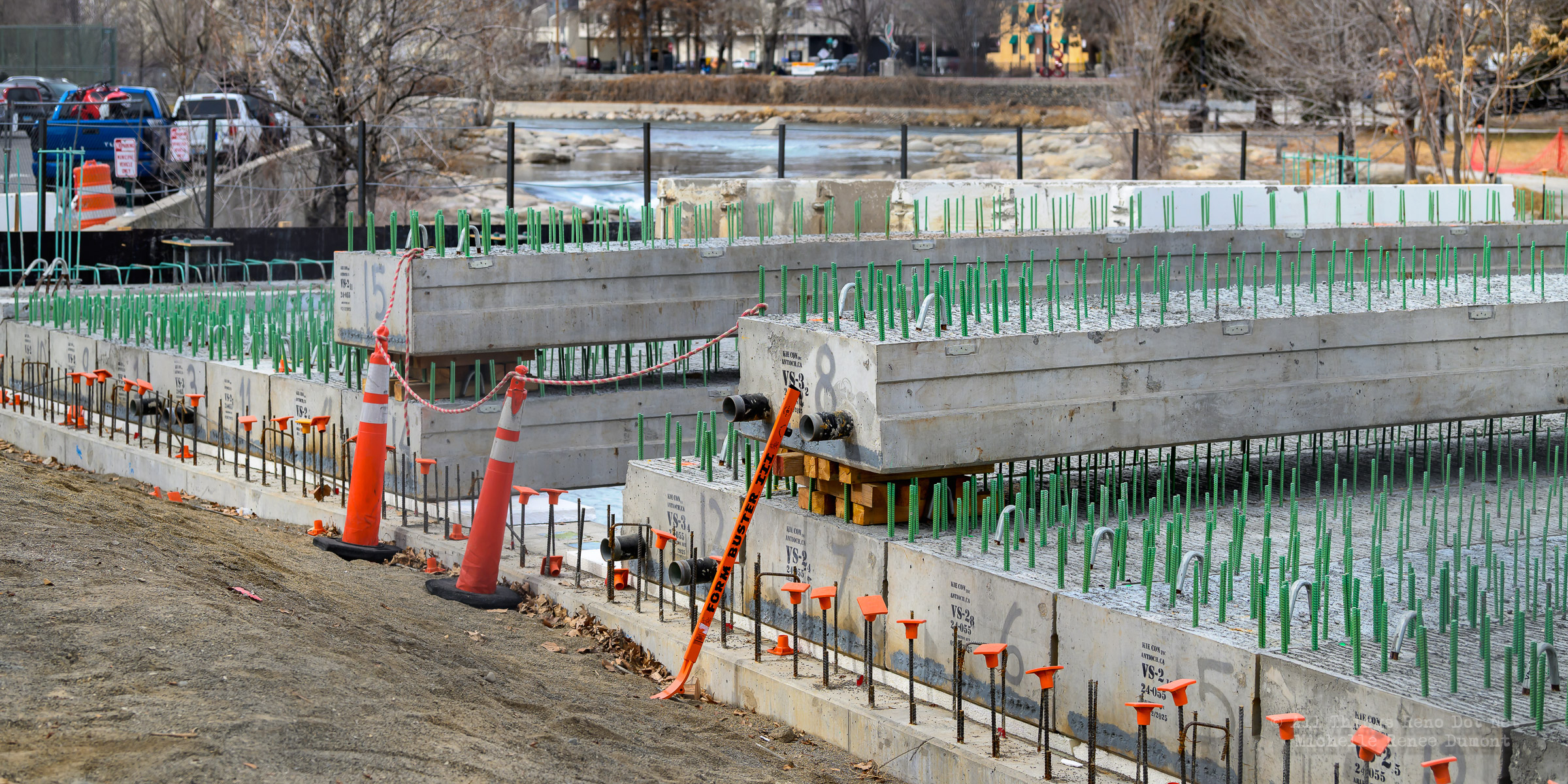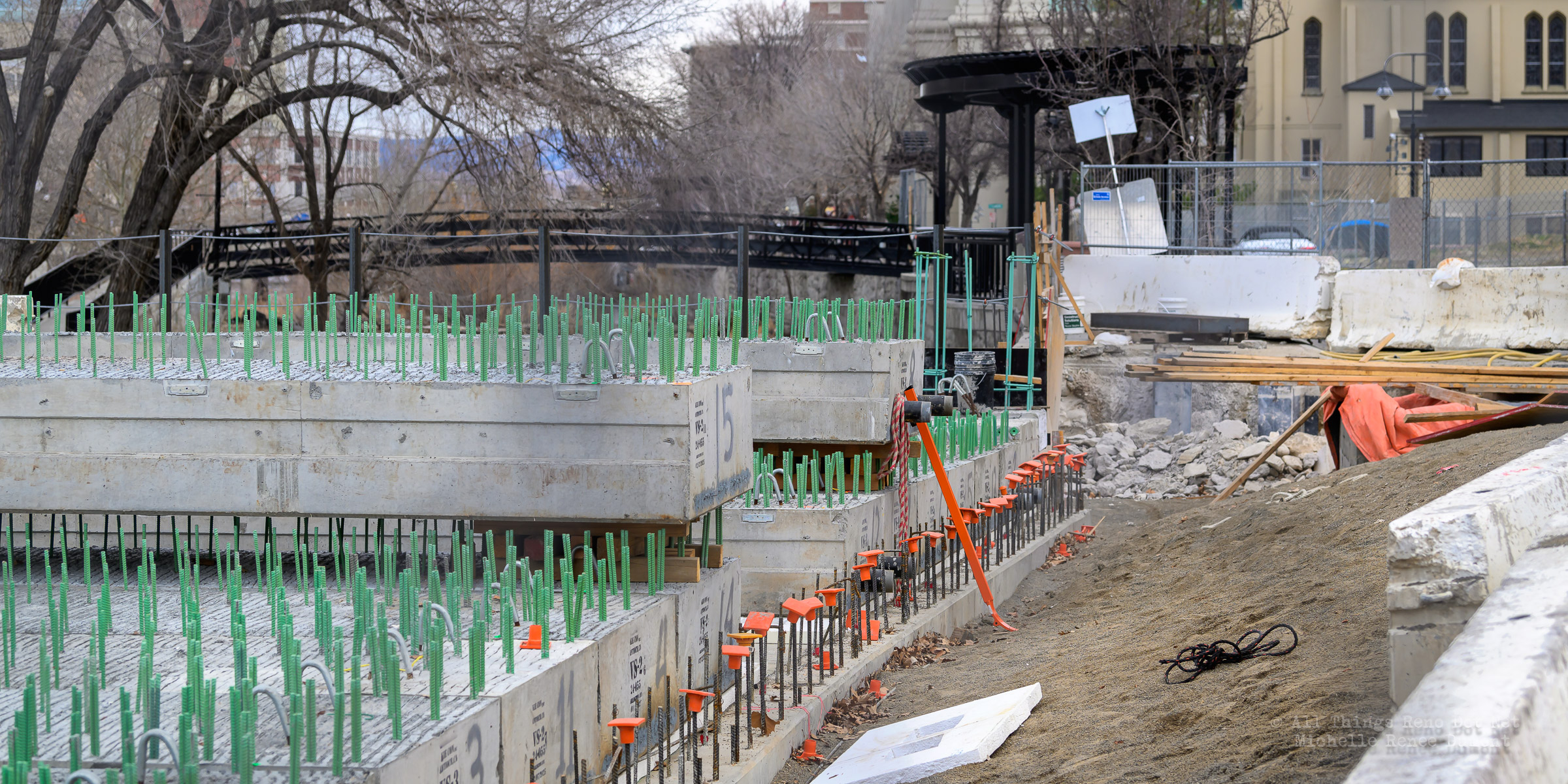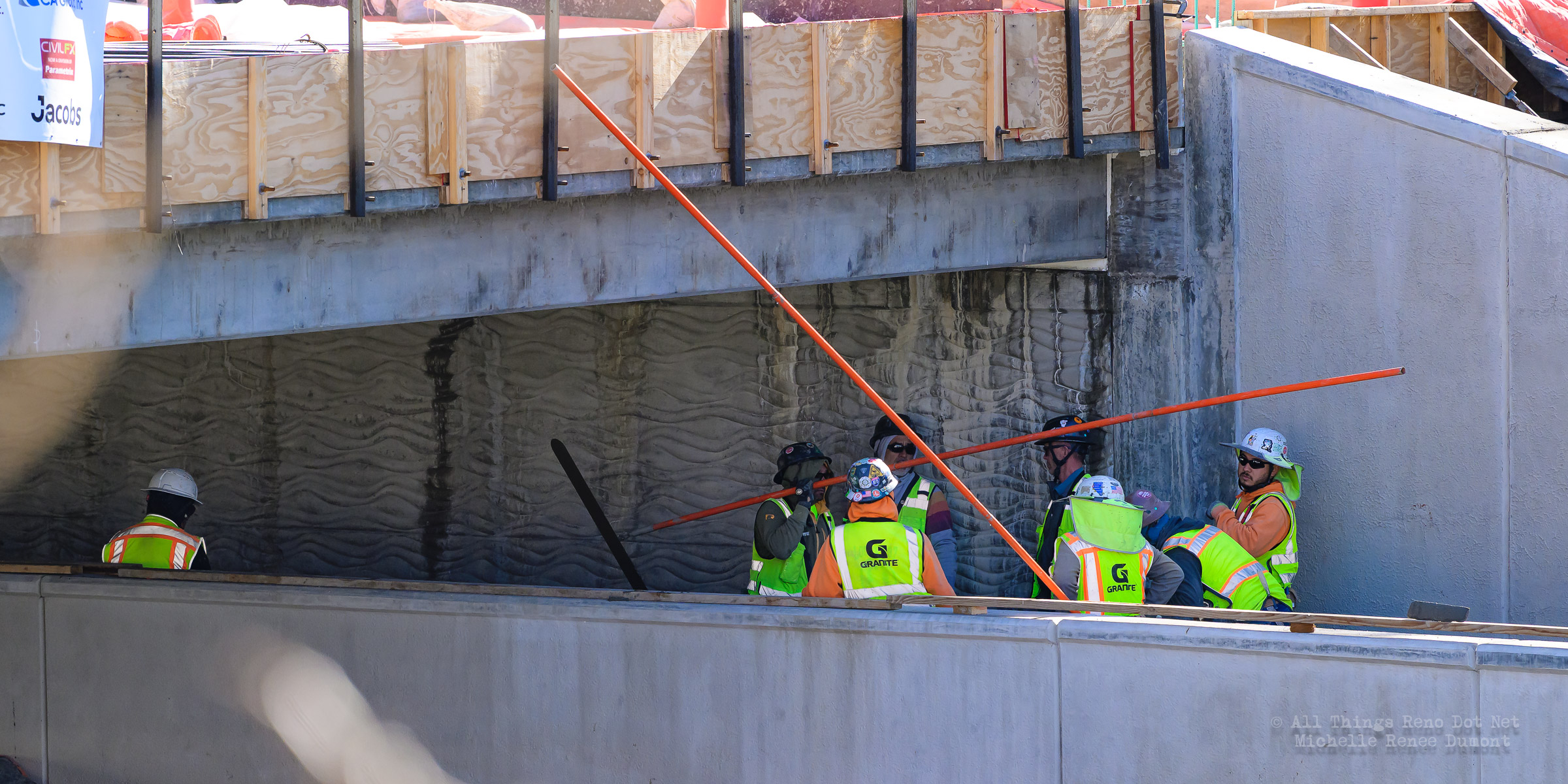The construction project continues with the pouring of concrete on the walkway leading under the main bridge and the cutting down of the final I-beams that were used to shore up the soil on the southern bridge. The I-beams had to be cut down by 3 feet to prevent them from protruding through the roadbed over time.