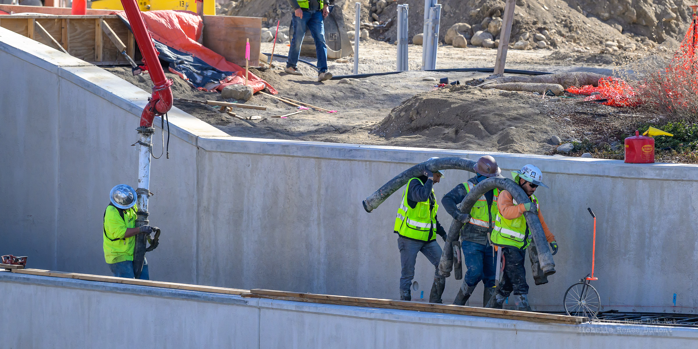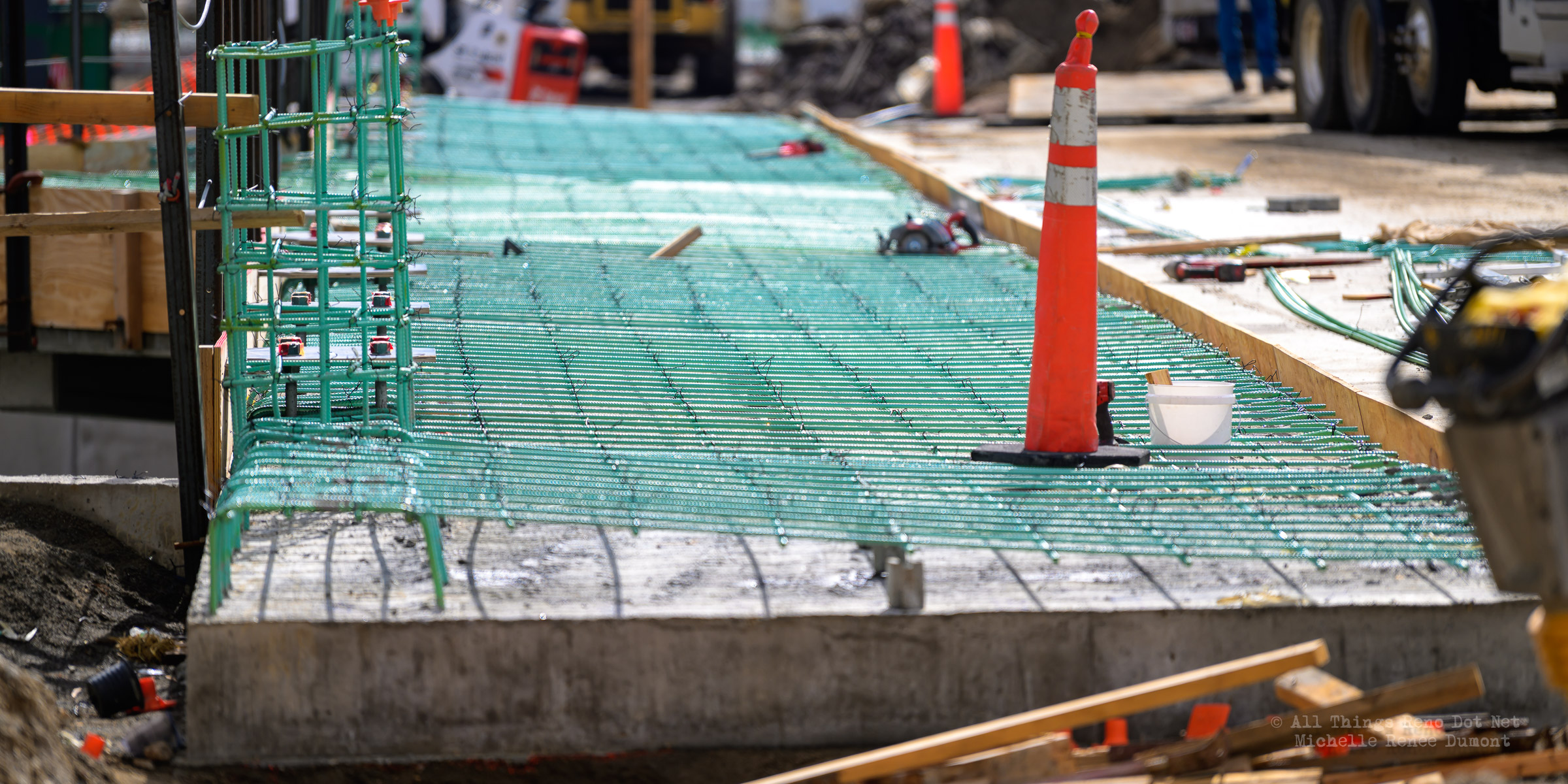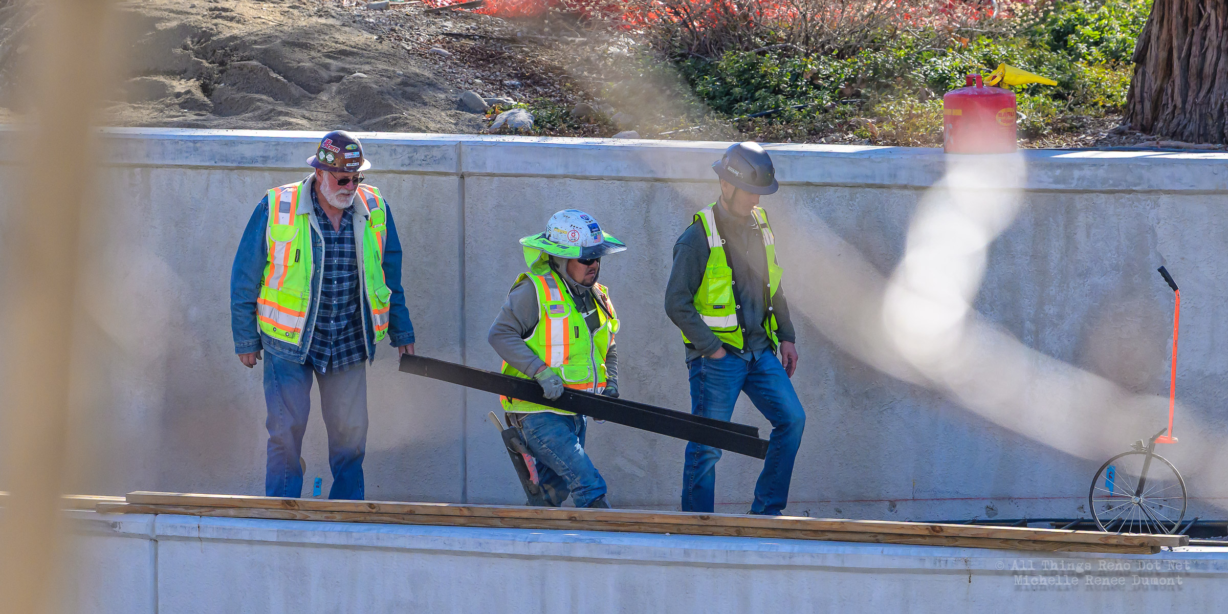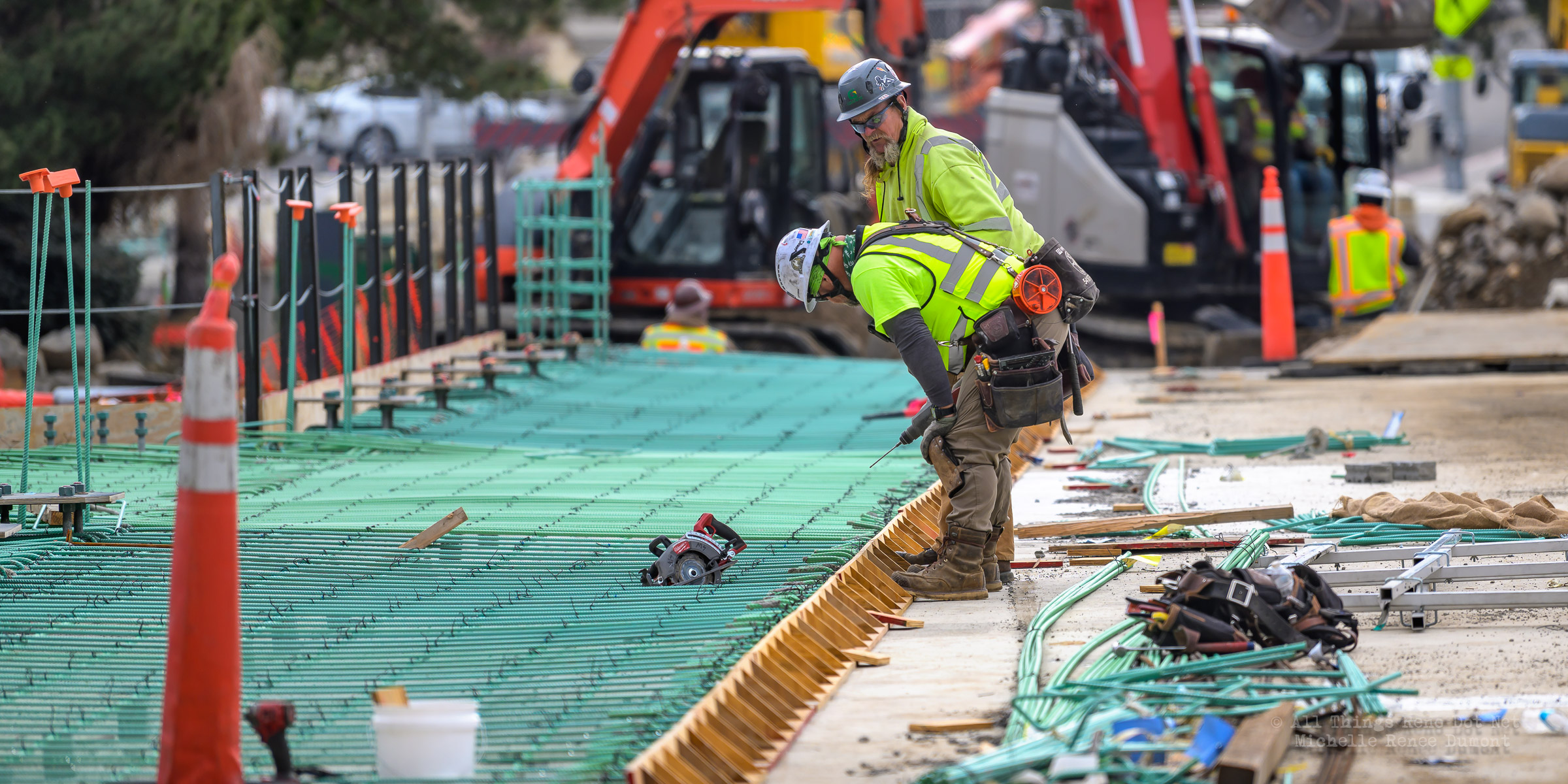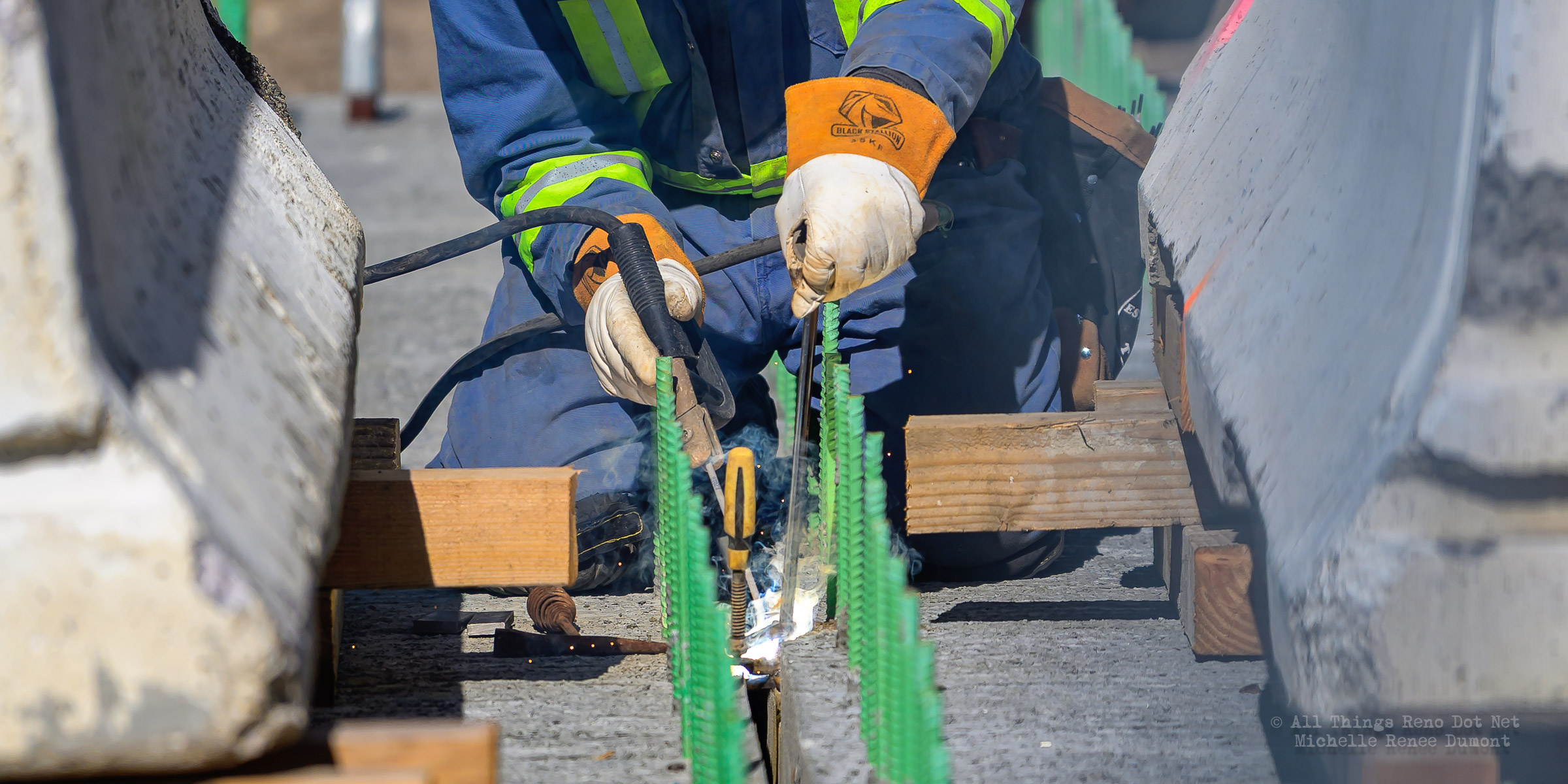 The construction project continues with the pouring of concrete on the walkway leading under the main bridge and the cutting down of the final I-beams that were used to shore up the soil on the southern bridge. The I-beams had to be cut down by 3 feet to prevent them from protruding through the roadbed over time.