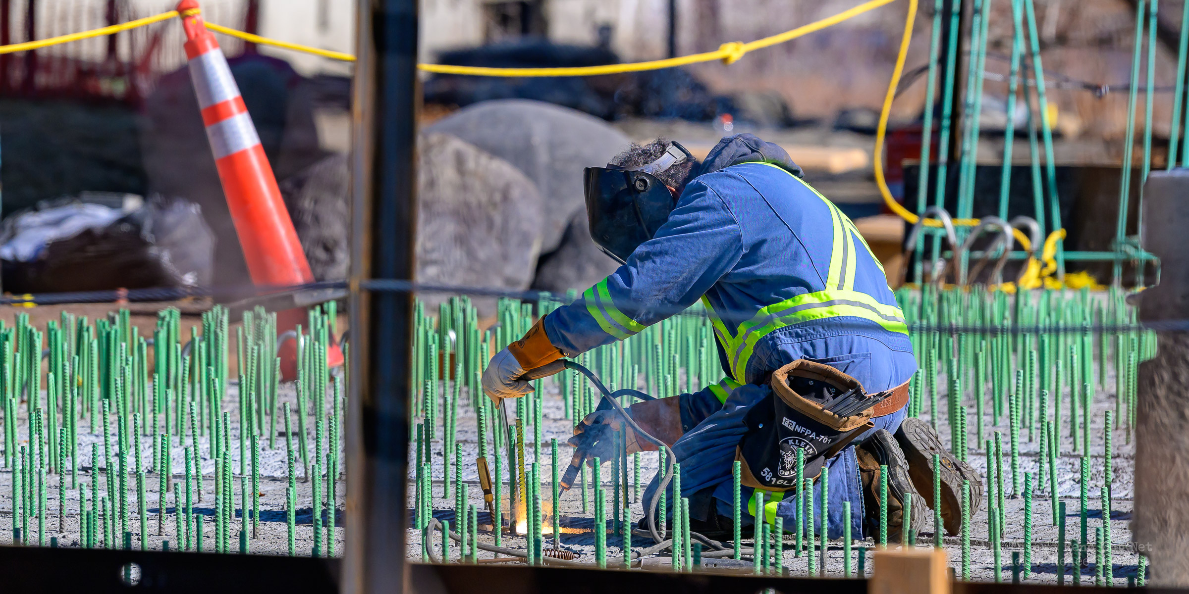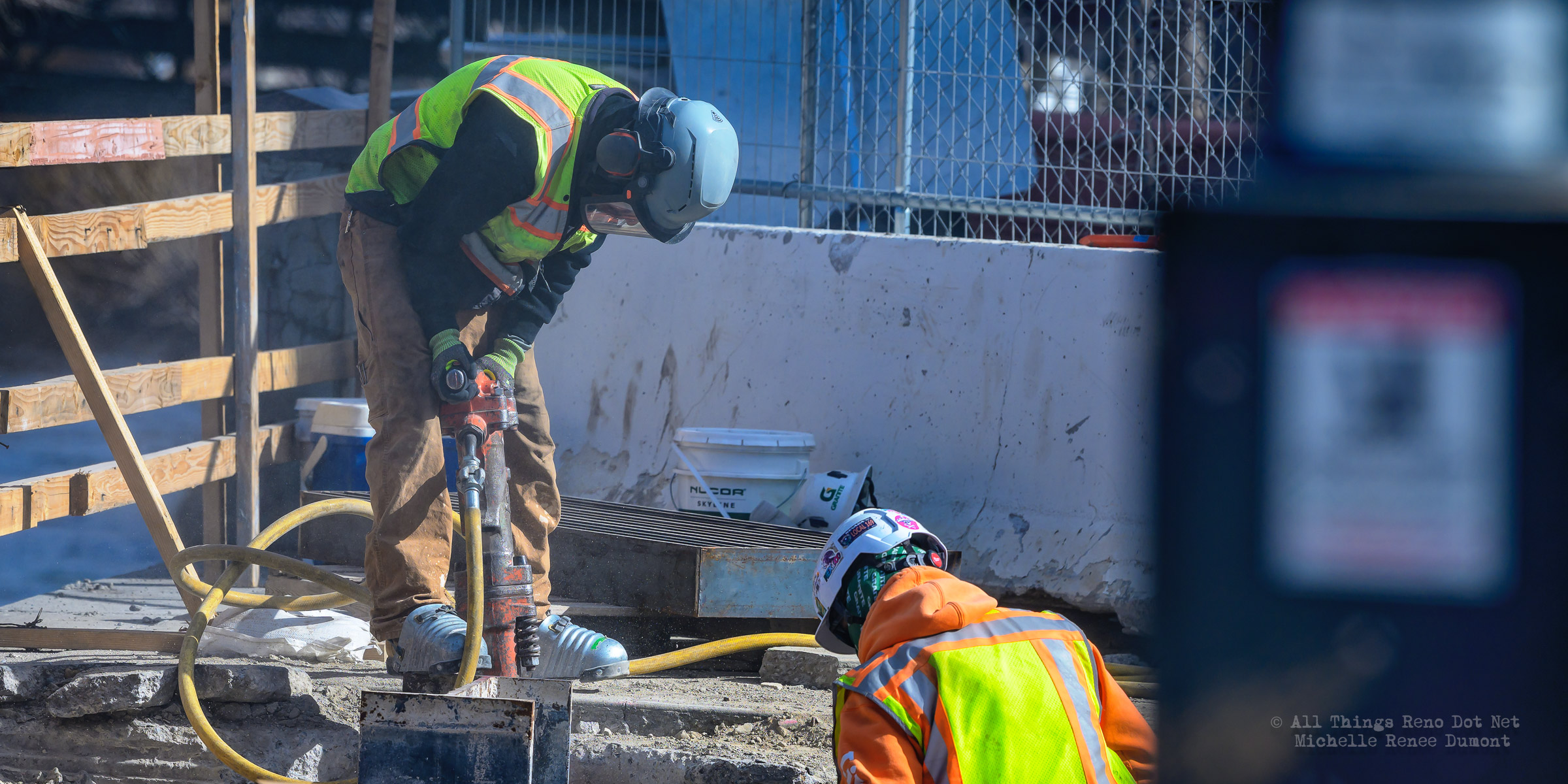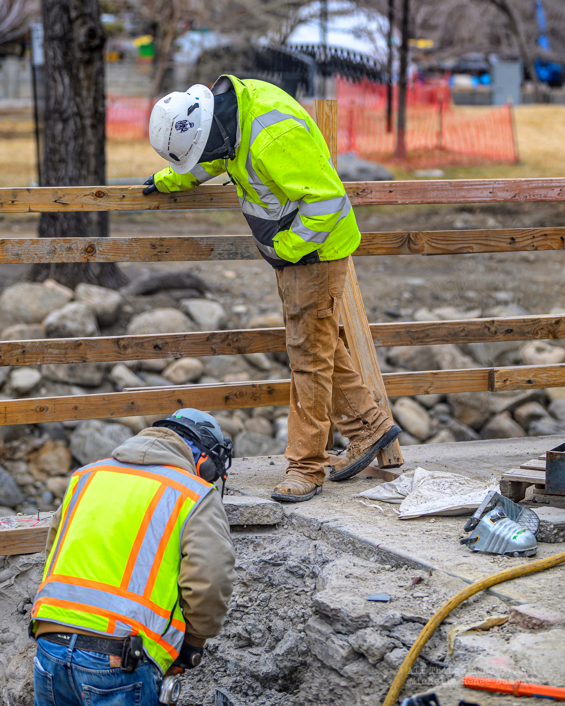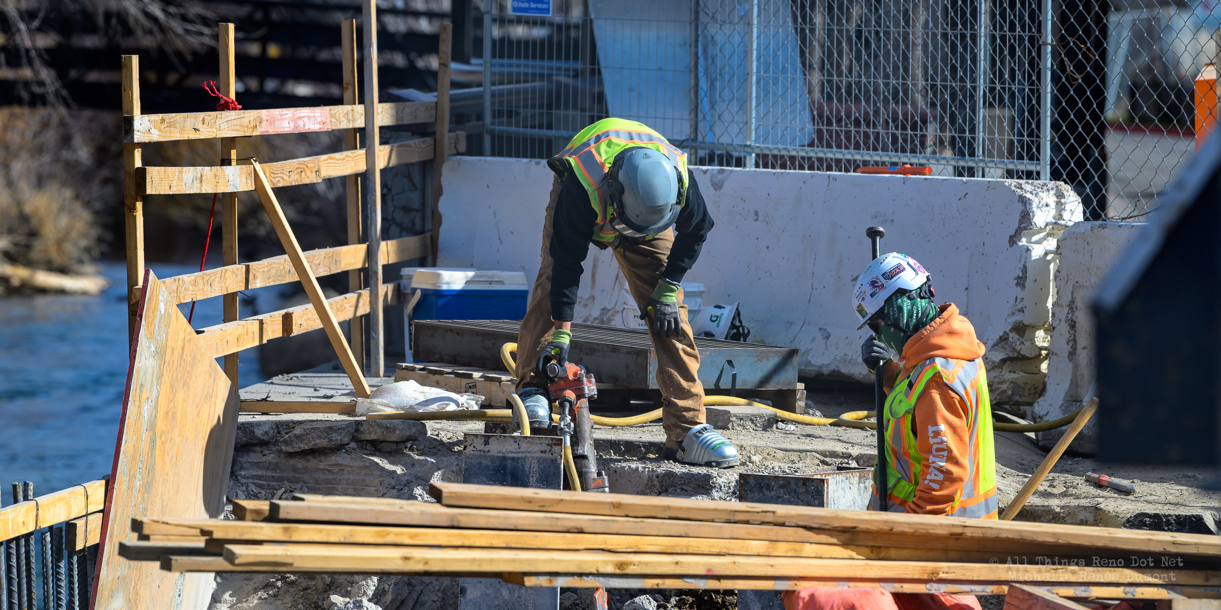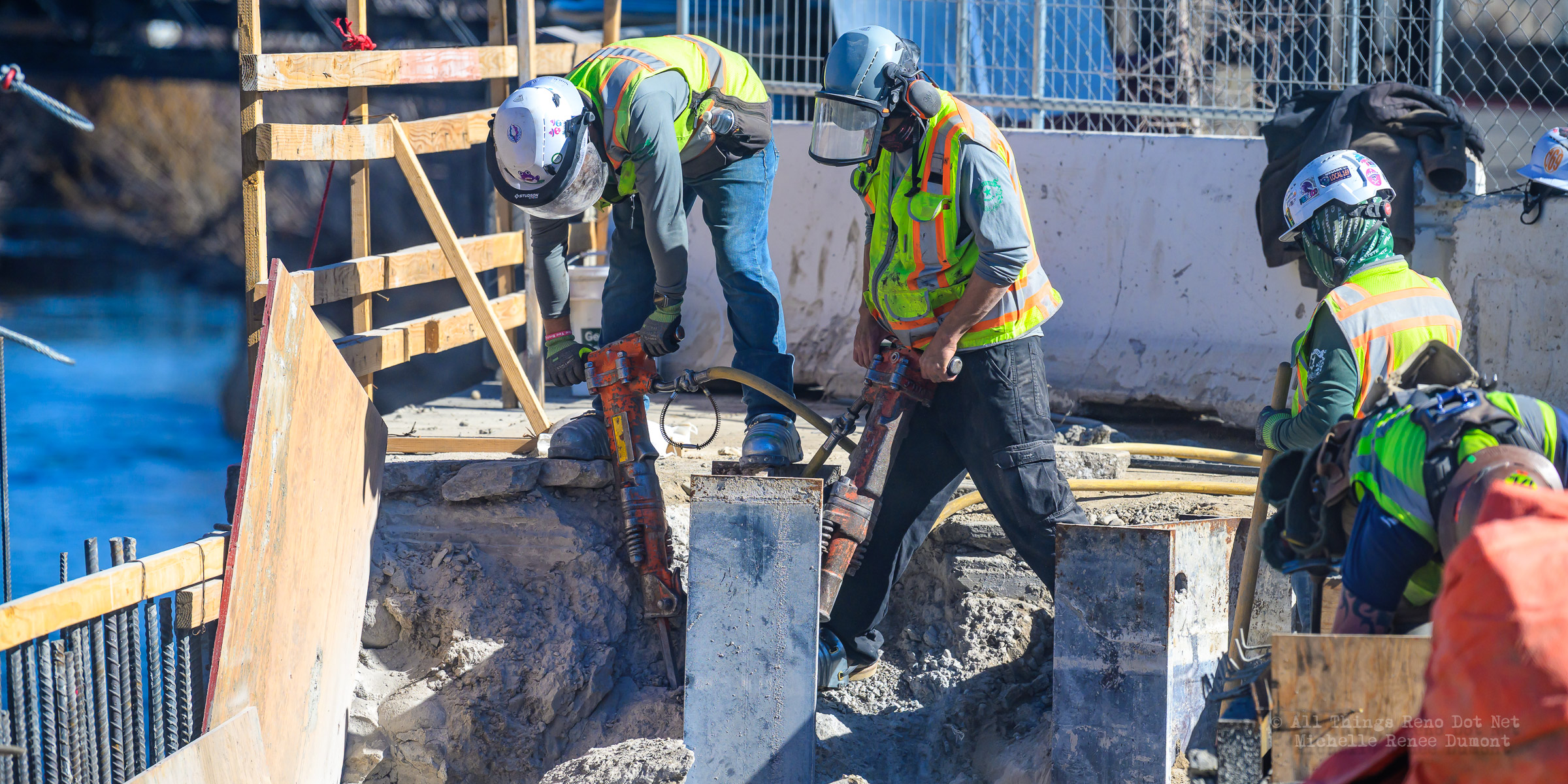 The construction project continues with the pouring of concrete on the walkway leading under the main bridge and the cutting down of the final I-beams that were used to shore up the soil on the southern bridge. The I-beams had to be cut down by 3 feet to prevent them from protruding through the roadbed over time.