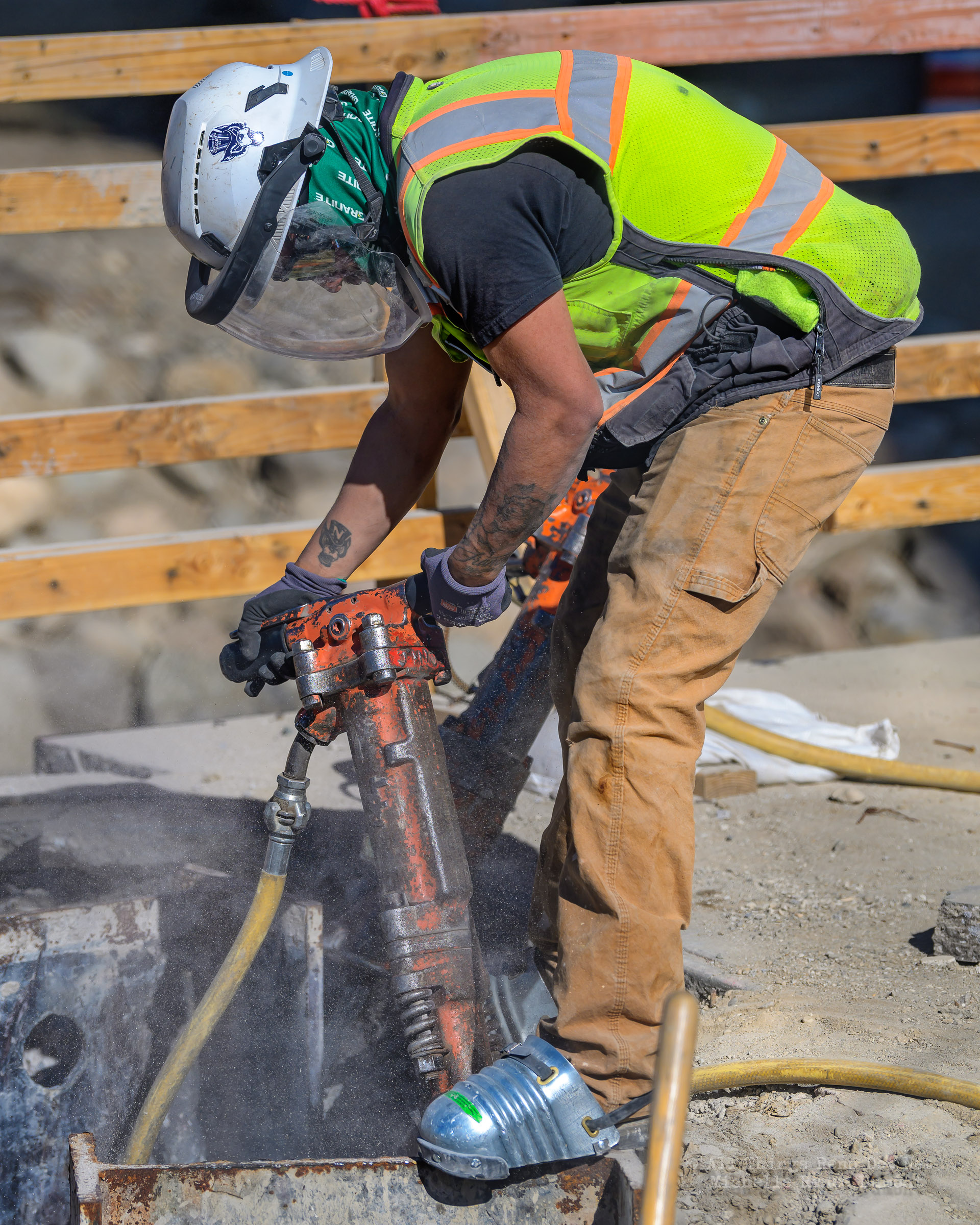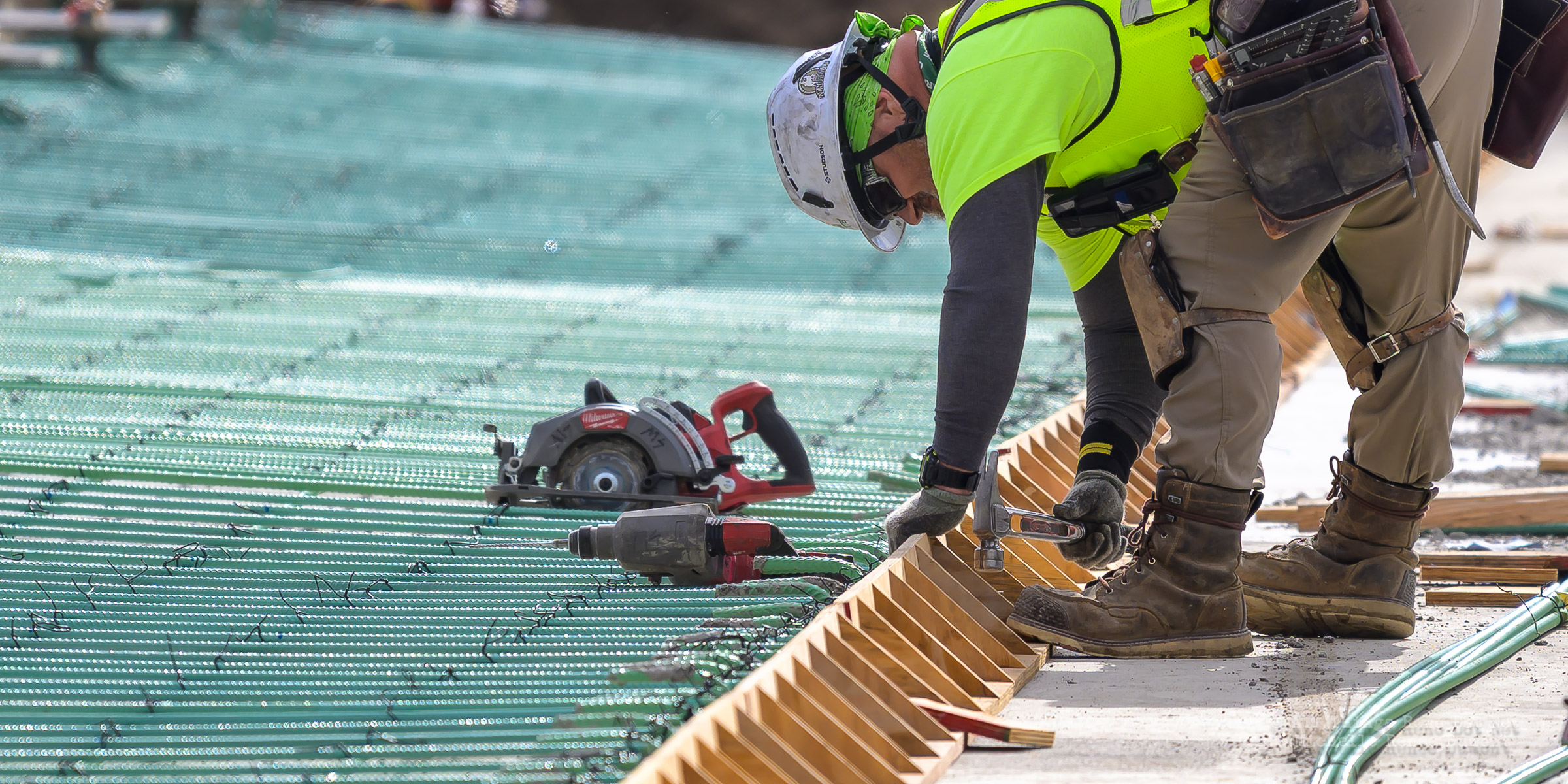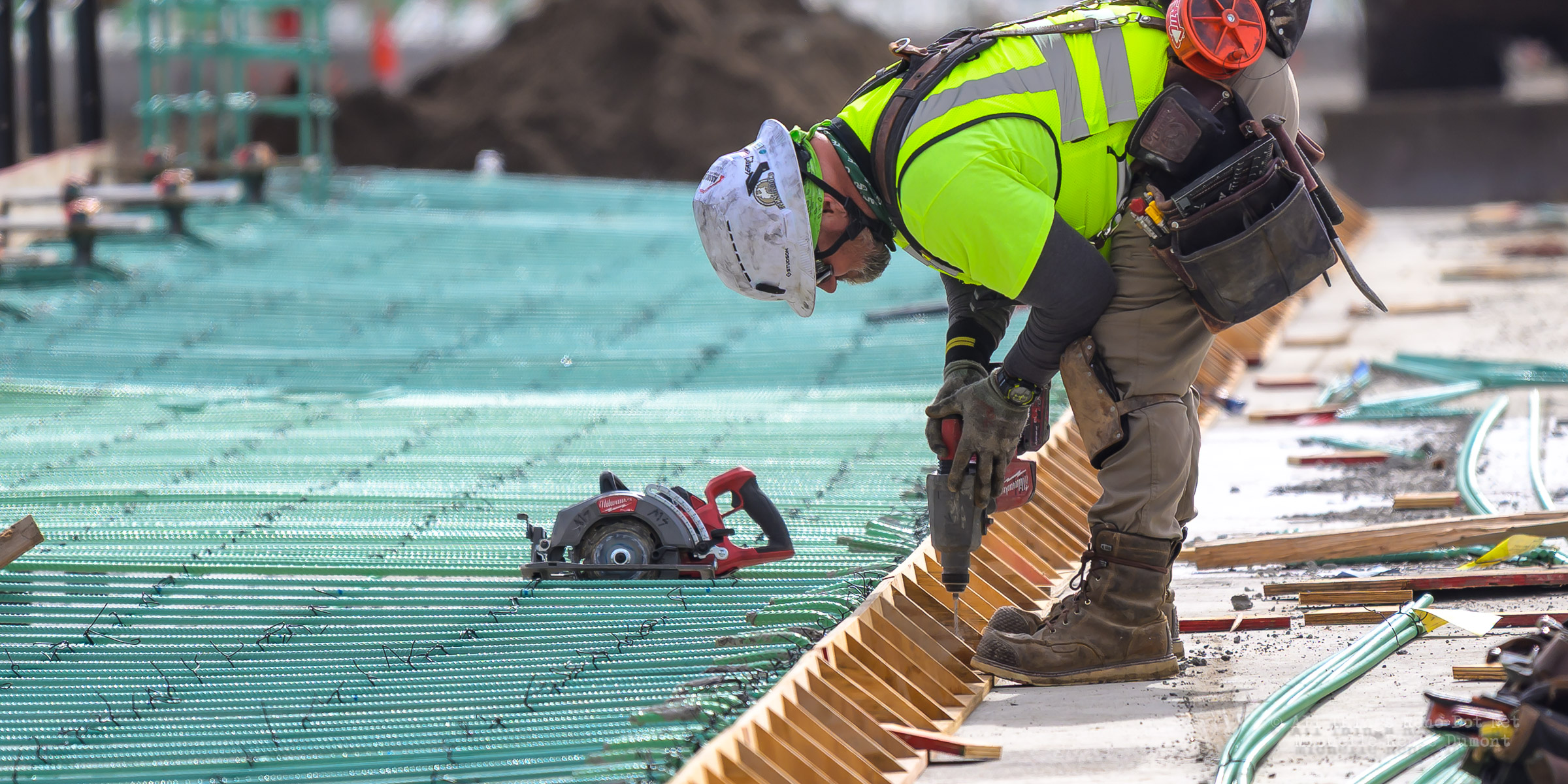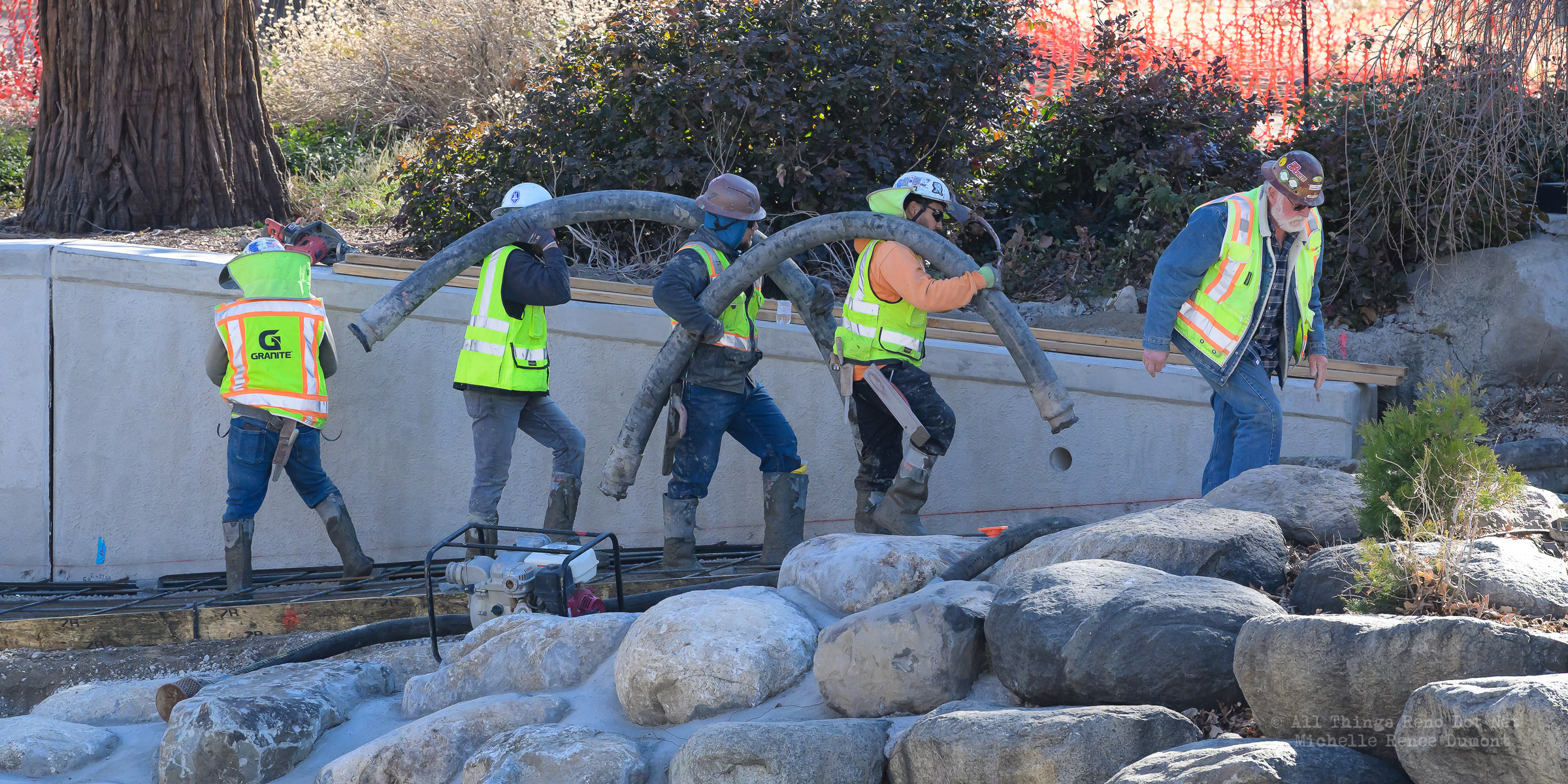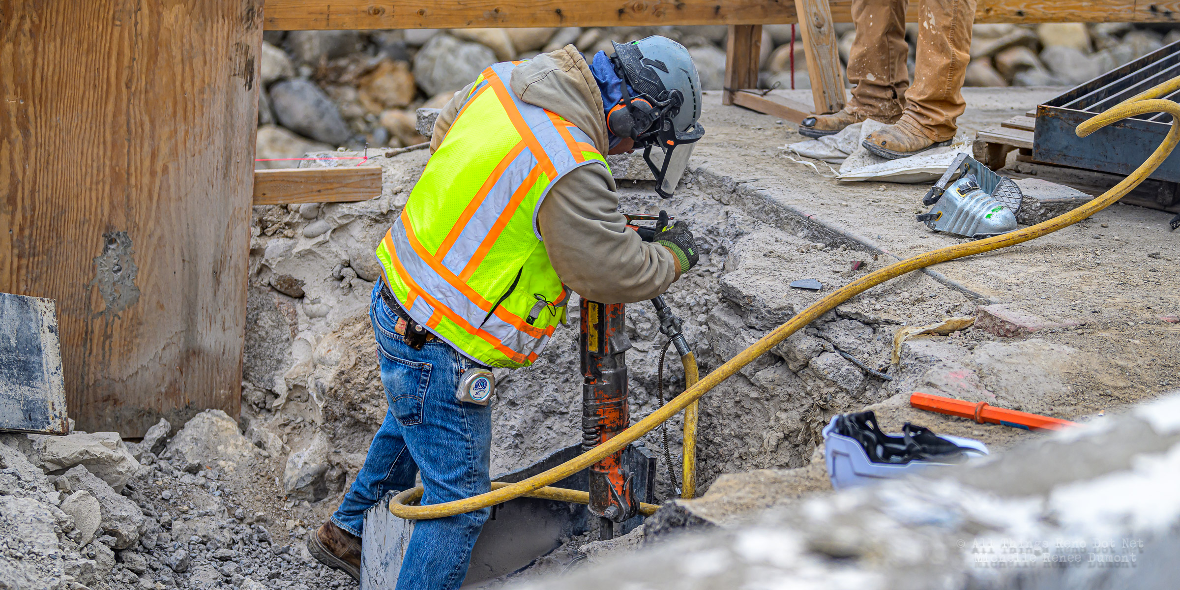 The construction project continues with the pouring of concrete on the walkway leading under the main bridge and the cutting down of the final I-beams that were used to shore up the soil on the southern bridge. The I-beams had to be cut down by 3 feet to prevent them from protruding through the roadbed over time.