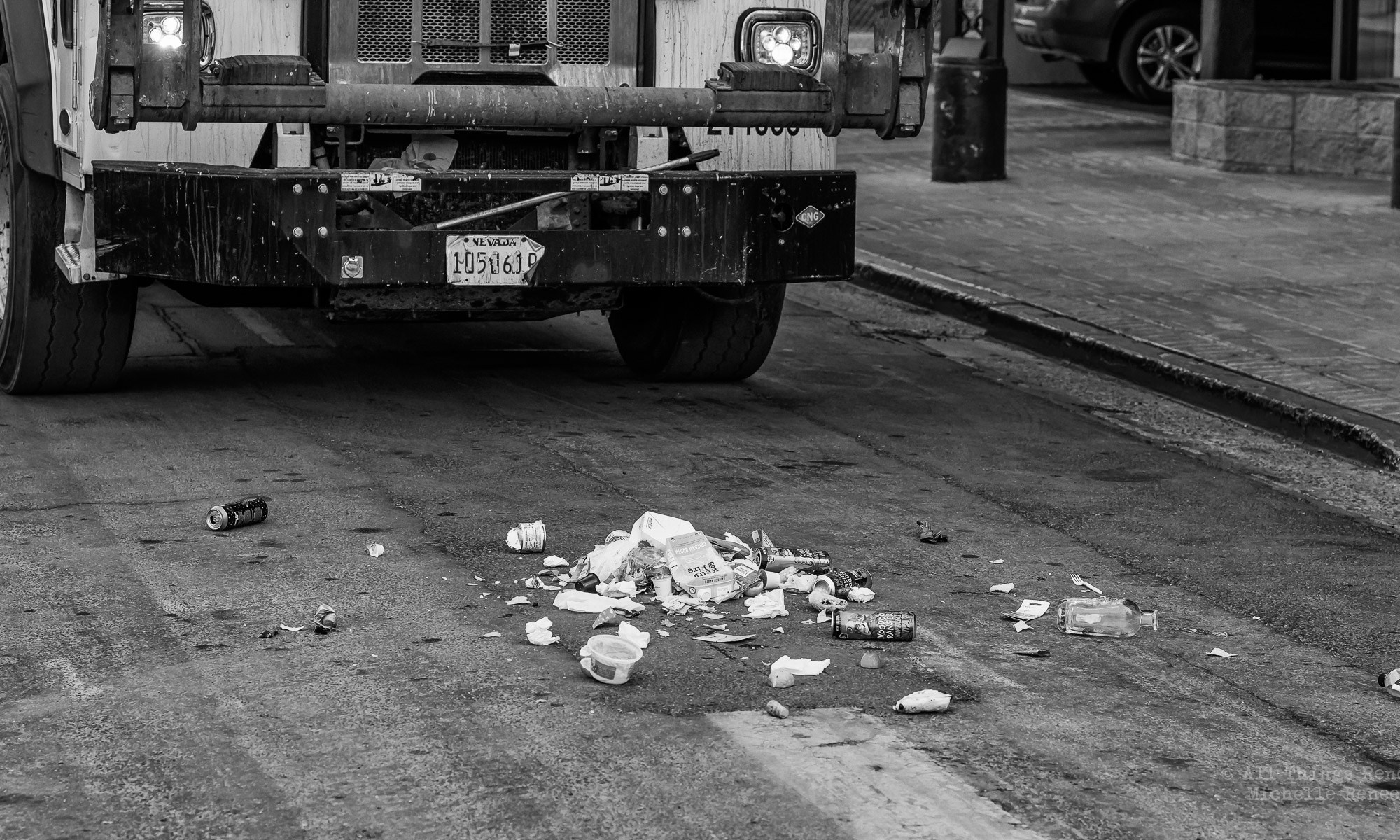 Watched the operator of this Waste Management truck load a dumpster onto the forks of the truck, lift the container and while the container was in the air several items fall to the ground. Once he emptied the container and returned it to the building, I was expecting him to grab a shovel or broom and pick up the mess, but…