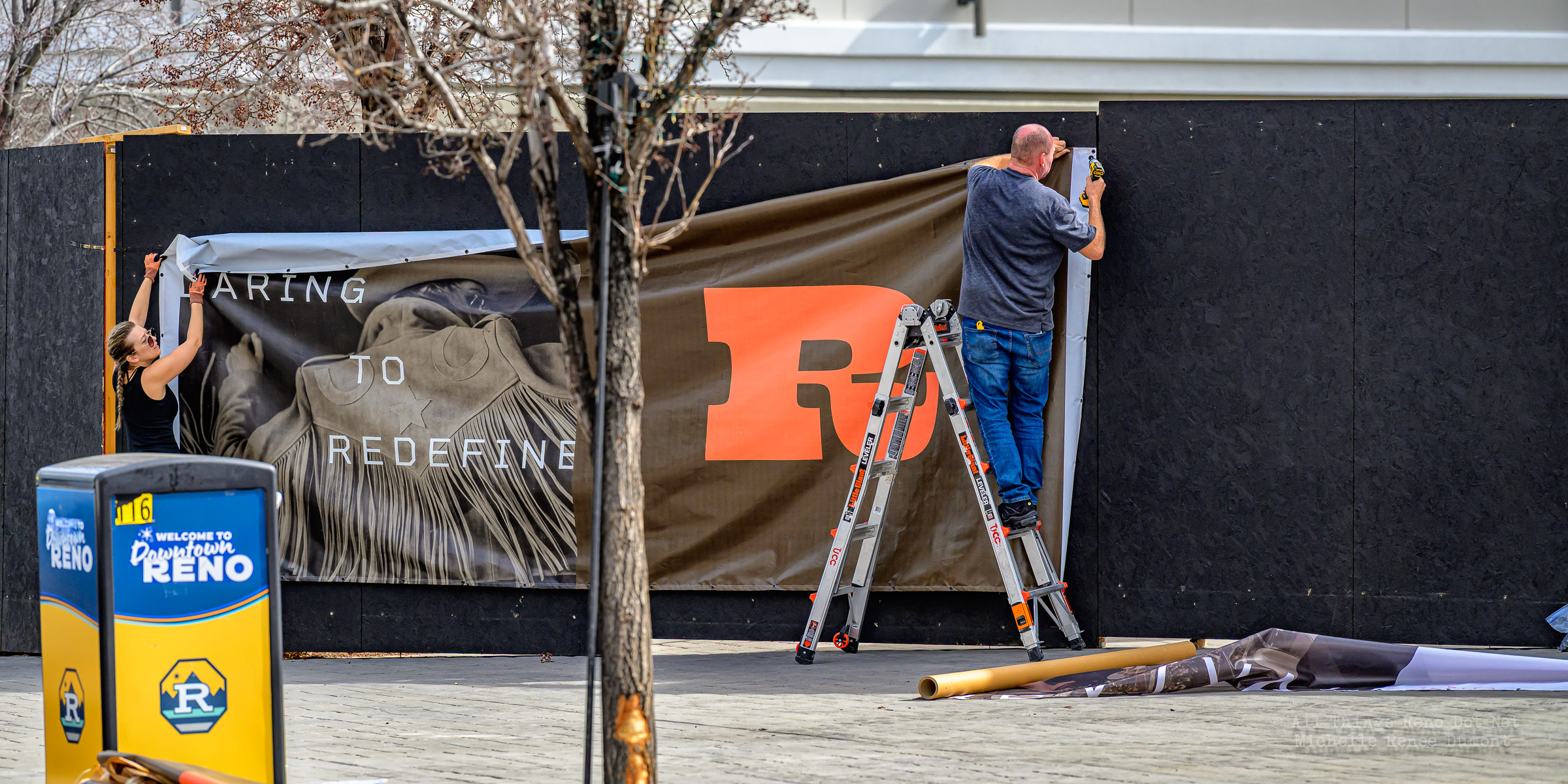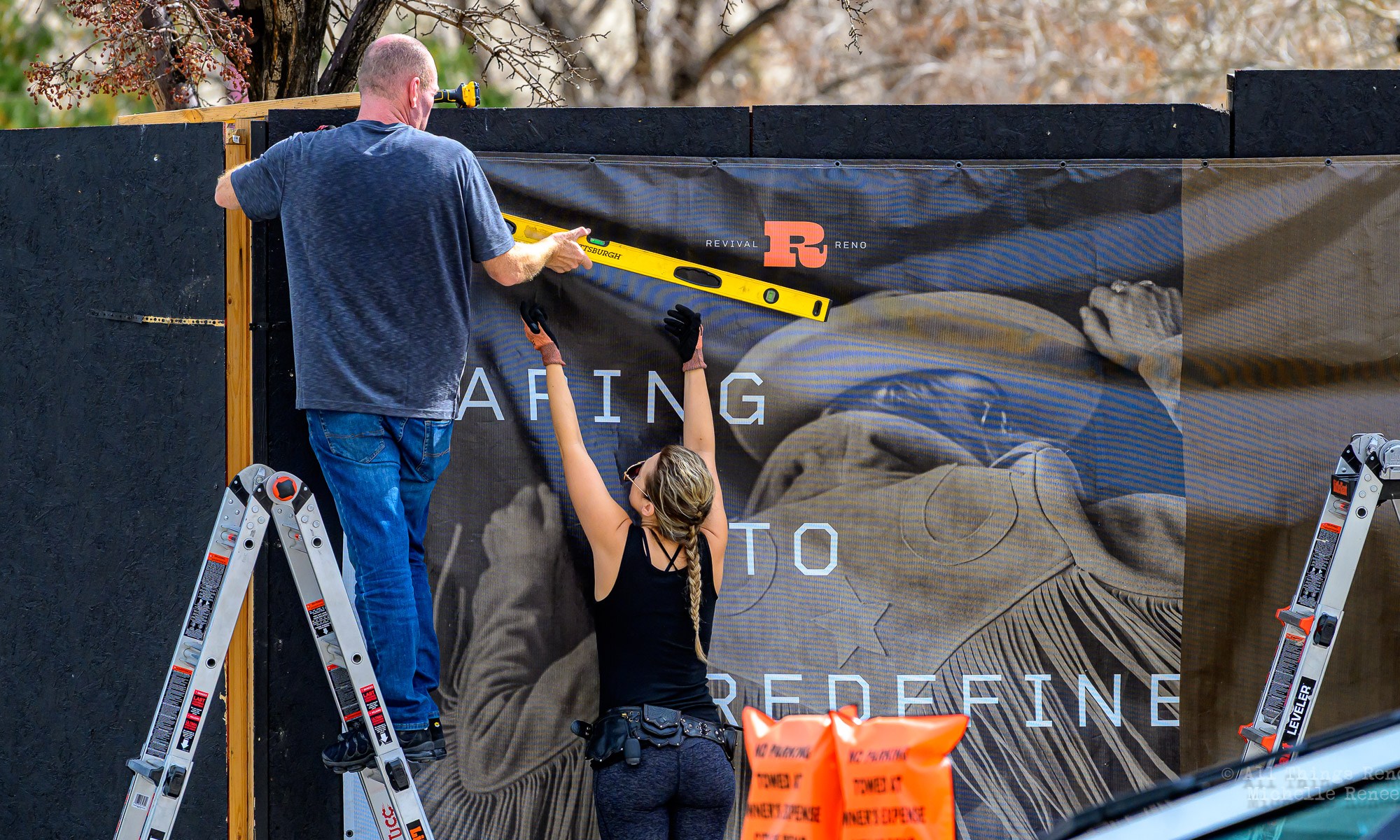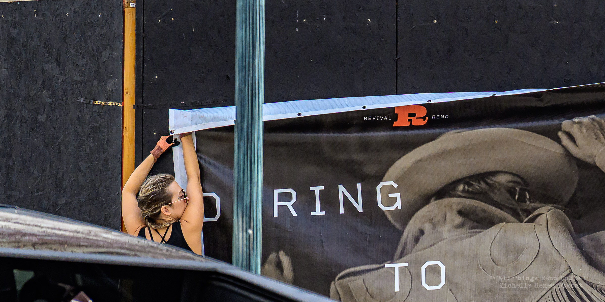 A new Ad Banner was being installed on the temporary fencing surrounding the plaza area of the closed Harrah’s Casino Resort. The property, closed permanently back during the Covid pandemic, is in the midst of a remodel/repurpose.