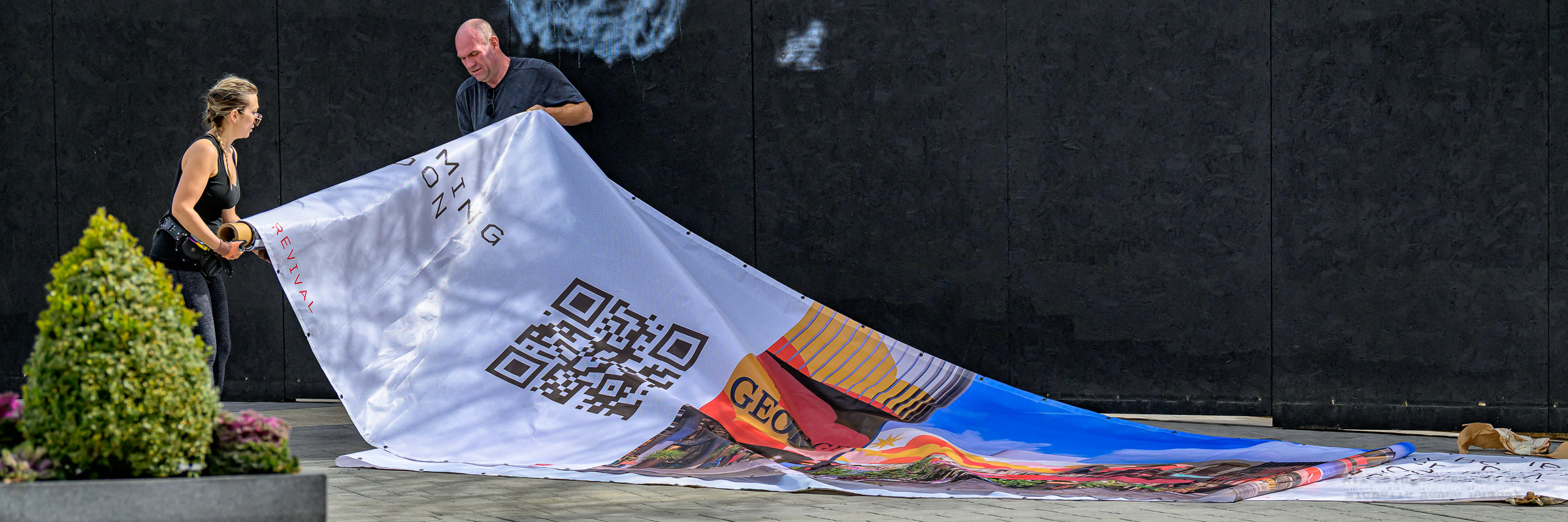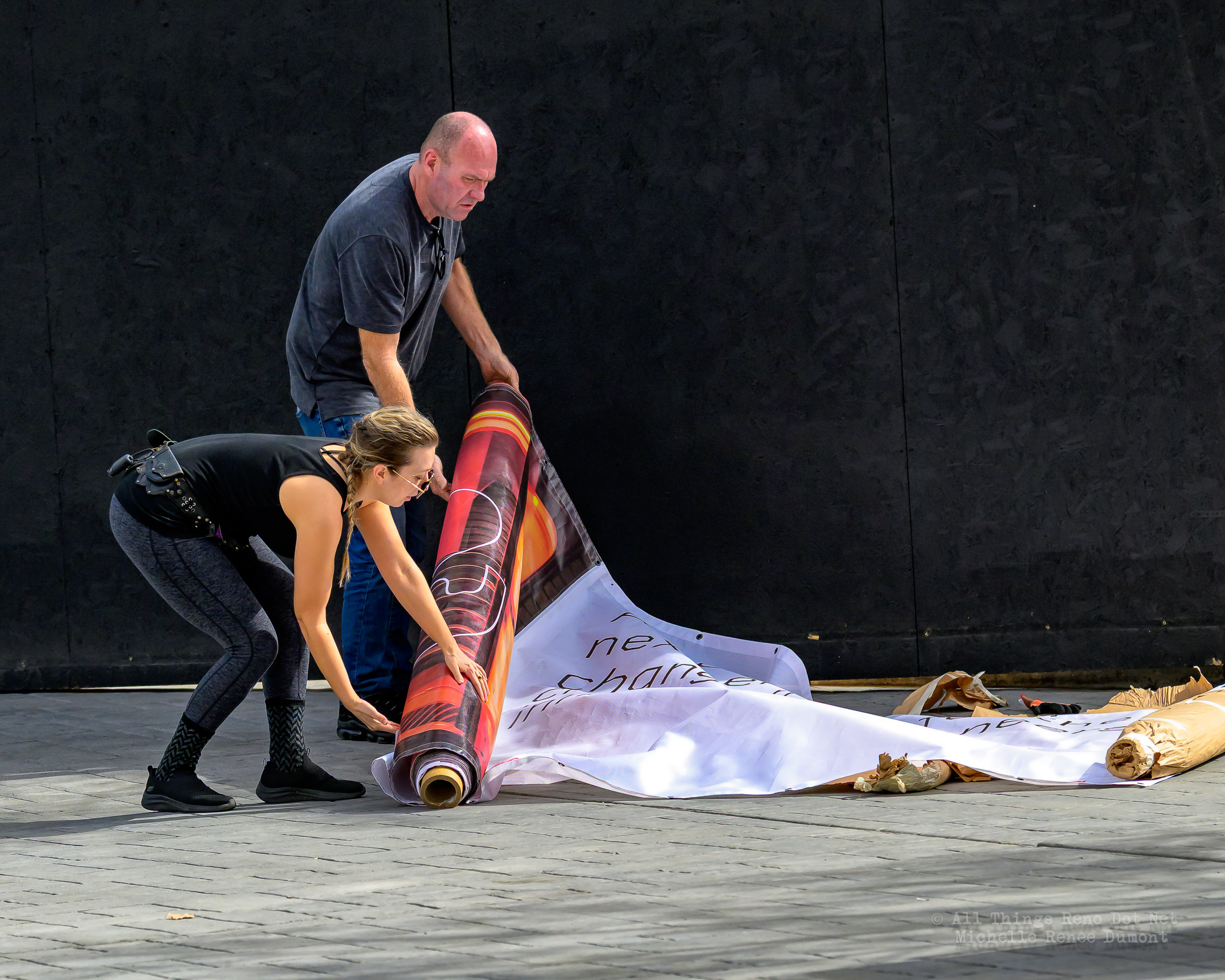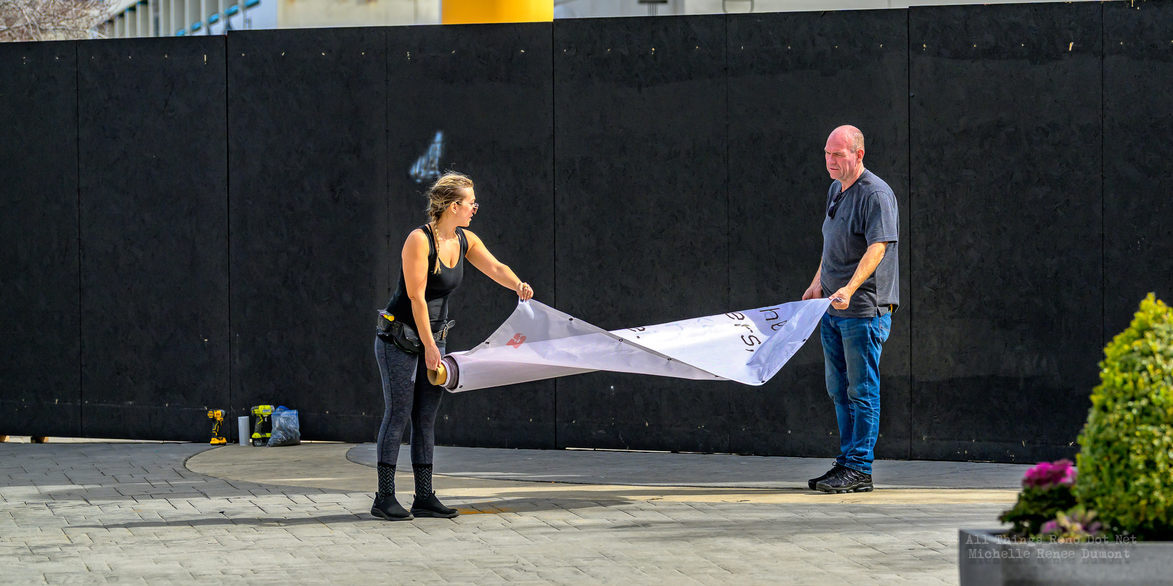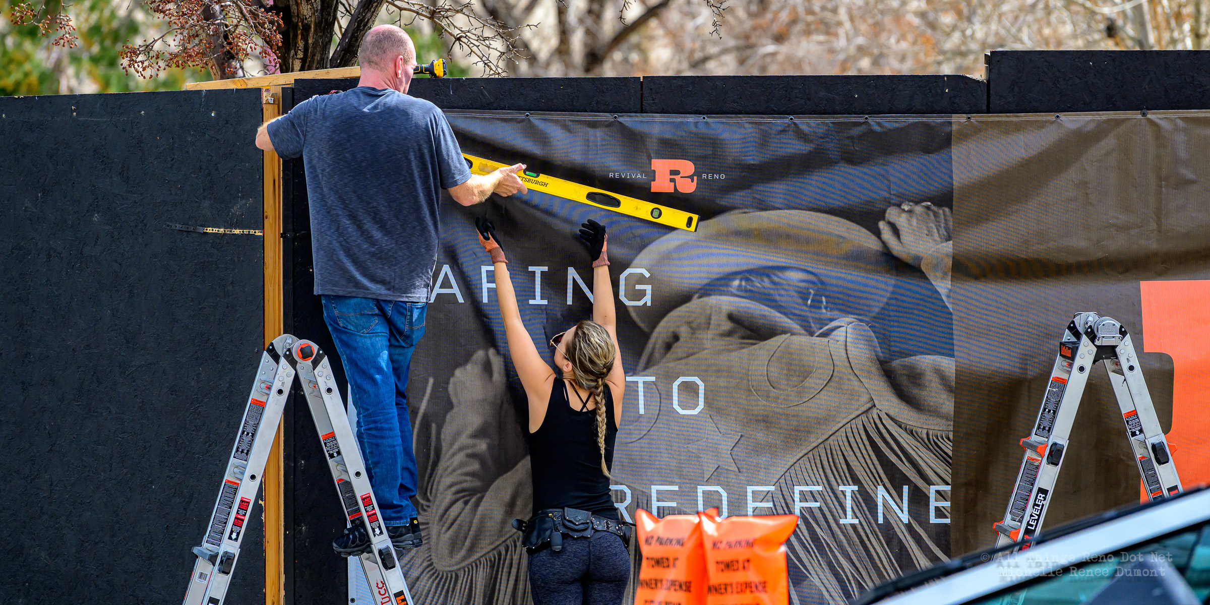 A new Ad Banner was being installed on the temporary fencing surrounding the plaza area of the closed Harrah’s Casino Resort. The property, closed permanently back during the Covid pandemic, is in the midst of a remodel/repurpose.